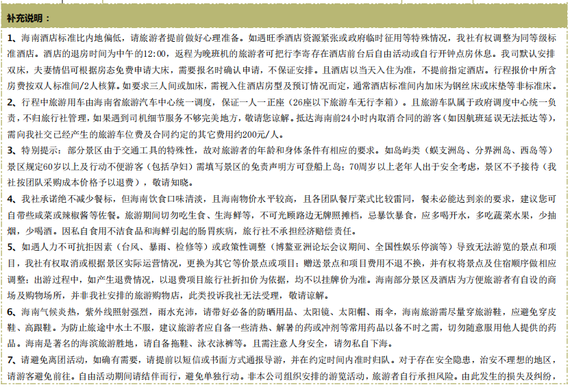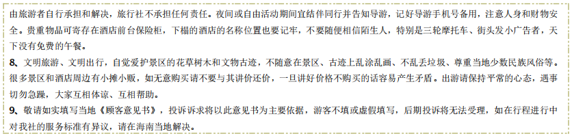 【亚龙湾国际玫瑰谷】(赠电瓶车,游览时间不少于60分钟)以美丽、浪漫、爱为主题,亚洲规模最大的玫瑰谷; 【南山佛教文化苑】(游览时间不少于120分钟)5A景区,南山主要景点有南山寺、海上观音、不二法门、观音文化苑、天竺圣迹、佛名胜景观苑、十方塔林与归根园、佛教文化交流中心、素斋购物一条街等。其中,108米海上观音是当之无愧的亮点之一,是世界首尊金玉观世音菩萨塑像,闻名全海南的镇岛之宝; 【大小洞天】(游览时间不少于120分钟)5A级景区洞天福地,寿比南山不老松的山海奇观,这里海天一色,海风习习,椰林婆娑,如诗如画,“碧海连天远,琼崖尽是春”叹为观止的800年崖州第一景观;