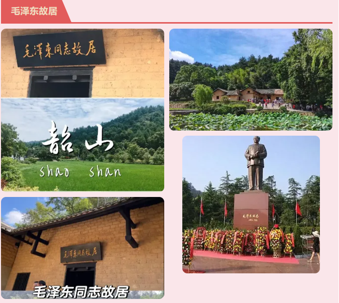 早游览【毛泽东广场】(如果大车不让开到附近,需要景区电瓶车,20元/人必须自理),集体佩戴主席像章、系上红领巾,在毛主席铜像前举行庄严肃穆的瞻仰仪式,表达对伟人的深切缅怀和敬仰之情。也可集体向毛主席铜像敬献花蓝,向伟大的共和国缔造者致敬(自主自愿表达,花篮20元自理)。后参观【毛泽东同志故居】(请提前关注微信公众号自行约票,提前3天放票)1893 年 12 月 26日毛泽东同志诞生于此,在这里生活了 17 年。1910 年秋,毛泽东胸怀救国救民大志外出求学。