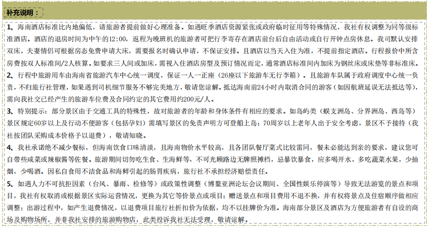 精选住宿(不同标准价格不同 任选其一): A 品质版:2 晚海口品质酒店,2 晚三亚海虹酒店; B 海边版:2 晚海口品质酒店,2 晚三亚海边酒店(携程四钻); C 海景版:2 晚海口精品酒店,2 晚三亚海边酒店海景房-帆船港高级海景房(携程五钻); 网红打卡: 蜈支洲岛 5A、南山 5A、天涯海角 5A、天堂公园 4A、玫瑰谷 3A 超值赠送: 价值 300/人三亚千古情演出、价值 138/人凤凰岭索道