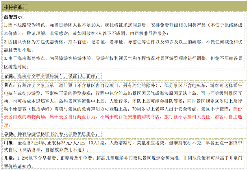 【南山佛教文化苑】(游览时间不少于 120 分钟)5A 景区,南山主要景点有南山寺、海上观音、不二法门、观音文化苑、 天竺圣迹、佛名胜景观苑、十方塔林与归根园、佛教文化交流中心、素斋购物一条街等。其中,108 米海上观音是当之无 愧的亮点之一,是世界首尊金玉观世音菩萨塑像,闻名全海南的镇岛之宝; 【天涯海角】(游览时间不少于 120 分钟)国家 5A 级景区,漫步蜿蜒的海岸线如同进入一个天然的时空隧道,在“南天一柱”、 “海判南天”、“天涯海角”等巨型摩崖石刻中徘徊,追寻古人足迹,体验浮世沧桑;