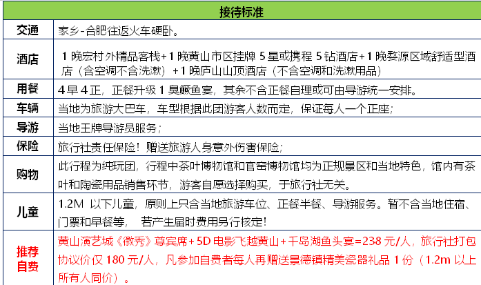 景区客流高峰,为确保及时送站/机,旅行社有权删减个别景点)。后返回合肥乘火车硬卧返程