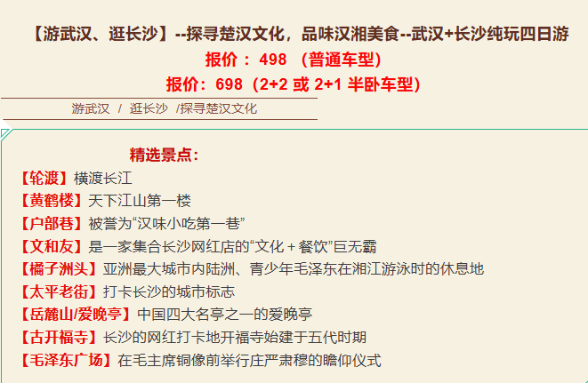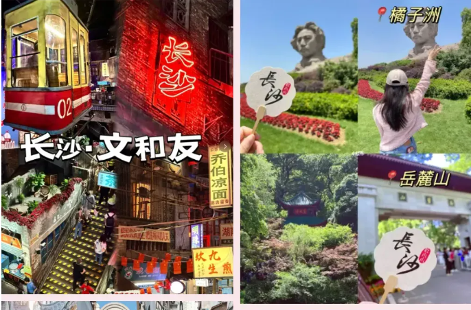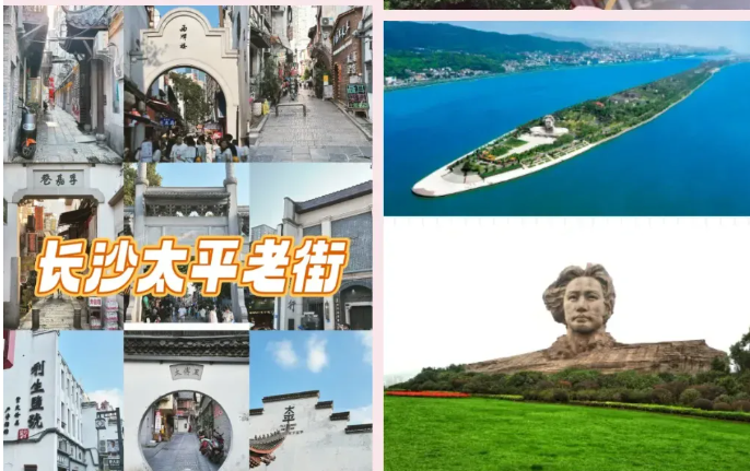 【轮渡】横渡长江 【黄鹤楼】天下江山第一楼 【户部巷】被誉为“汉味小吃第一巷” 【文和友】是一家集合长沙网红店的“文化+餐饮”巨无霸 【橘子洲头】亚洲最大城市内陆洲、青少年毛泽东在湘江游泳时的休息地 【太平老街】打卡长沙的城市标志 【岳麓山/爱晚亭】中国四大名亭之一的爱晚亭 【古开福寺】长沙的网红打卡地开福寺始建于五代时期 【毛泽东广场】在毛主席铜像前举行庄严肃穆的瞻仰仪式