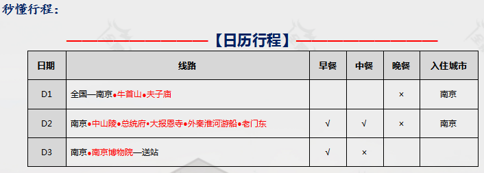※ 温馨提示:“中山陵、总统府”周一闭馆,并实行实名制预约,如因旅游旺季未预约成功,则安排游览雨花台或其他景区,敬请谅解。