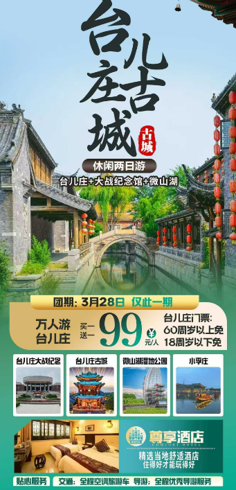 早指定时间 指定地点集合出发参观全国百个爱国主义教育基地、红色景点【台儿庄大战纪念馆】(自由参观 60 分钟),感受战火纷飞的战争年代,乘车赴【5A台儿庄古城】(门票【60周岁以上、18周岁以下免票】),台儿庄重在修复遗留在古城区的明清运河段,恢复清代康乾盛世时期古镇历史风貌,再现“一河渔火,歌声十里,夜不罢市”的历史古韵,台儿庄古城位于枣庄市境内,世界文化遗产京杭大运河穿境而过,明清时期被誉为“天下第一庄”,现为国家AAAAA级景区,被美国有线电视新闻网(CNN)评为“中国最美的五大水乡”之一。城内拥有3公里古运河道和15公里水街水巷,建有十大主题街区,40个文化展馆,218栋精品院落,1088座单体建筑,被誉为“运河文化的活化石”、“中国民居建筑博物馆”,入住古城准三特色客栈