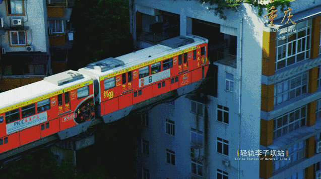 李子坝轻轨站:重庆轨道交通2号线李子坝车站是国内第一座与商住楼共建共存的跨座式单轨高架车站,。该站位于嘉陵江畔的李子坝正街39号商住楼6-7层,因其“空中列车穿楼而过”成为蜚声中外的“网红车站”。