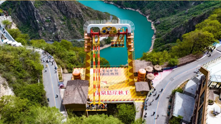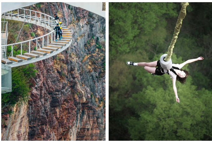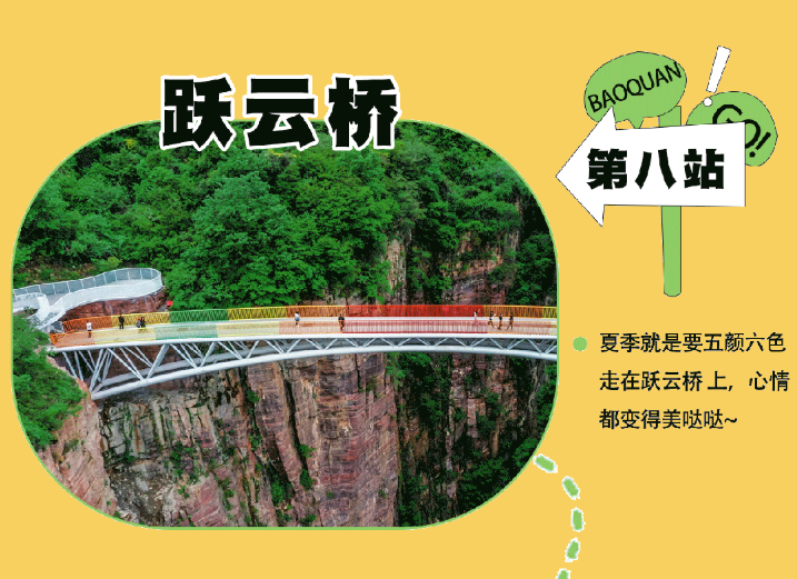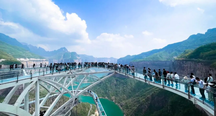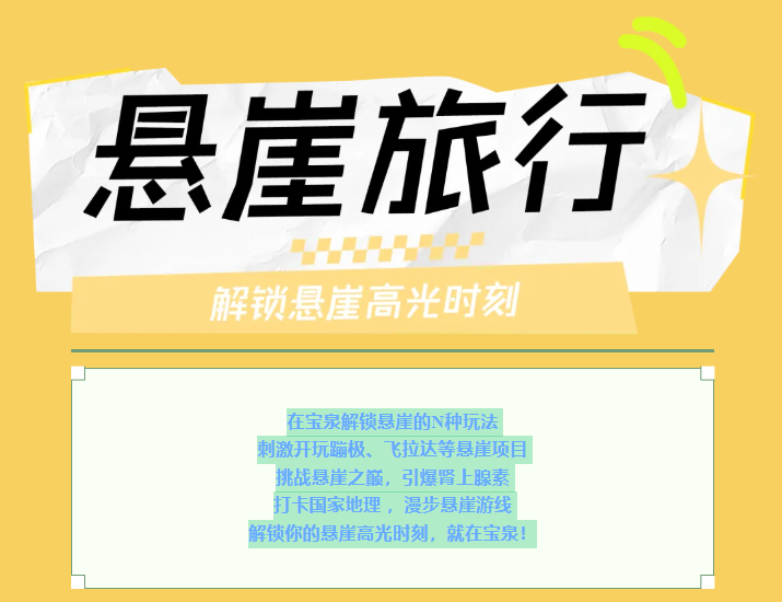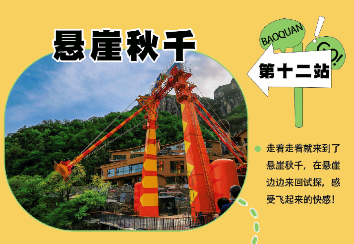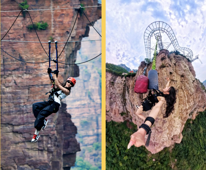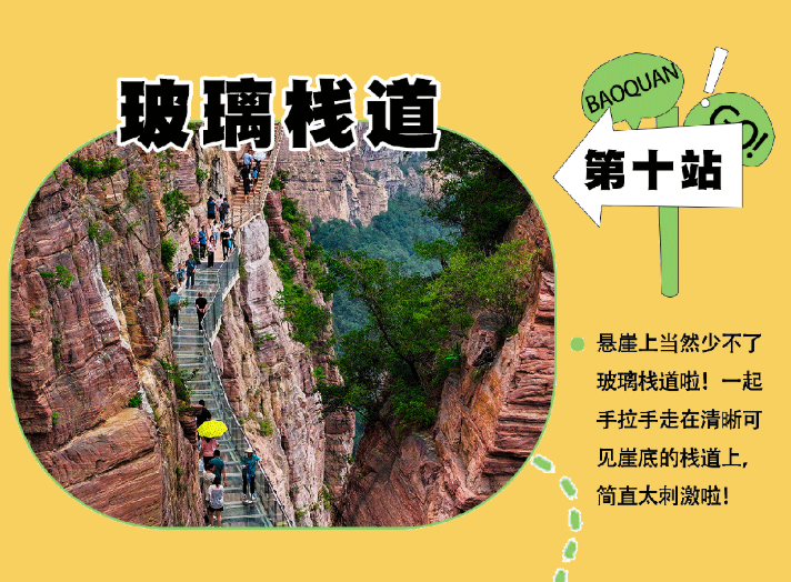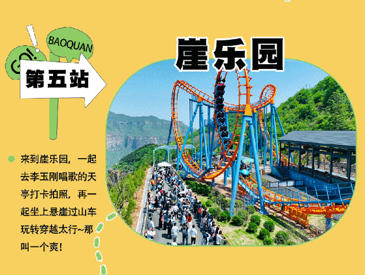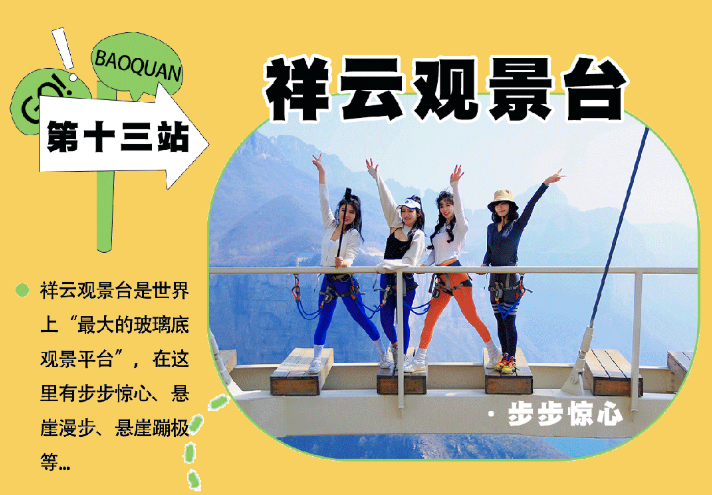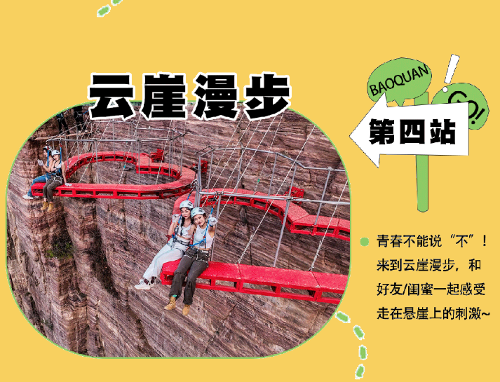 乘观光车到达文化氛围浓厚的“七贤台”拍照打卡,后前往吉尼斯世界记录官方认证的“世界上最大玻璃底观景平台”【祥云观景平台】,整体形态就像一片漂浮的七彩祥云,环绕在山间,此处涵盖了悬崖蹦极、悬崖漫步、玻璃空中滑道和步步惊心等多种体验项目(客人可根据自身身体情况自愿选择),后可免费体验【悬崖秋千】单次搭载32人的装置,瞬间把人送达百米之外,体验过山车般的失重体验,后沿步道继续前行,到达“悬崖玻璃栈道”,走过玻璃栈道体验它的有惊无险。穿过“挂壁公路” 到达“彩虹桥”经过彩虹桥后,又到一网红打卡地“天空之镜”拍照打卡,拾级而上,我们到达了中心服务区——【崖乐园】,主要包含有无动力攀爬、郁金香儿童乐园、星空营地、穿越太行、可免费体验山顶【悬崖过山车】真正享受崖上的尖叫与刺激。可在太行食坊用餐,后沿悬崖线的轮廓铺设三公里游览步道【丹崖天路】欣赏太行山中的蓝眼泪宝泉游龙湾大峡,谷湖光山色,抵达索道站乘坐“世界最大单体单层吊箱往复式索道”——【洛伽寺索道】(投资近3亿元,采用国际先进、国内一流的可承载200人的往复式吊厢,运行速度 10 米/秒,是目前国内承载量和运量最大的往复式“空中客车”,可谓是宝泉三个吉尼斯纪录之一)下山。