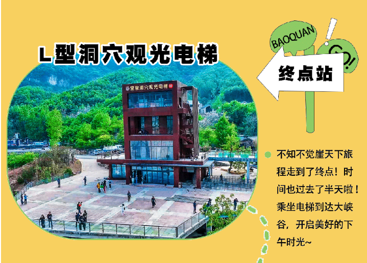 早05:30美术馆集合出发,赴太行山深处一块未经人工雕凿的原始美景——辉县宝泉旅游度假区(车程约3.5个小时),抵达后乘坐景区小交通沿景区盘山路观赏游龙湾——红岩绝壁,骆驼峰,游龙峡谷,七坝下车,开始游览【宝泉大峡谷】——沿亲水步道抵达宝泉号欢乐岛,儿童游乐场,3D玻璃吊桥,观水上飞人表演,后抵达桃花坪,稍事休息后,经过吊索桥,走过奇石苑,到达一淡蓝淡蓝的水面,平静柔和,清澈见底,浅滩的地方有可供游客朋友们下水嬉戏的场地,大家可以跳入碧绿的水中,尽情的打水仗,尽享夏日的清凉。沿奇石走廊至天瀑谷,观落差320米的“见龙瀑”,瀑布最大流量可达3000立方米/秒,似云龙飞瀑,气贯如虹,号称“中原第一瀑”。网红打卡地“鱼鳞坝”打卡拍照, 后乘吉尼斯世界纪录——“336米的L型洞穴电梯”到达八百里太行最精华的一段,【宝泉“崖天下”】