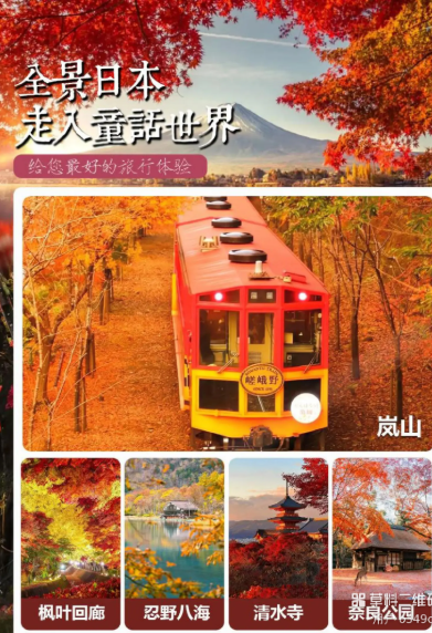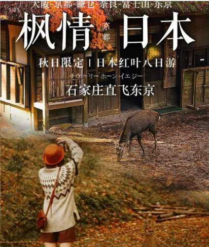 【枫情日本】 东京/镰仓/富士山/京都/大阪/奈良/全景八日游 东京全天自由活动 行程特色: 直 飞:石家庄直飞日本黄金时刻方便快捷。 红叶狩:✿新宿御苑、✿枫叶回廊、忍野八海、✿岚山&渡月桥、清水寺、 鹤冈八幡宫、大阪城公园、奈良公园、浅草寺等。 王牌行程:本州精华全覆盖,一价全含,不推自费 日本现代的象征——东京: 浅草寺:位于东京都台东区,是东京的发源地、东京最古老的寺庙。 秋叶原:俗称为 AKIBA,是日本与时代尖端产业同步的电器大街。 银座:象征着日本的繁荣,与巴黎的香榭丽舍大道,纽约的第五大道并列为世界三大繁华中心。 新宿御苑:东京最大的日式庭园和法式庭园相结合的公园,横跨东京都新宿区与涩谷区 东京塔:东京的地标性建筑与观光景点。其以法国巴黎的埃菲尔铁塔为范本而建造,正式名称为日 本电波塔 日本自然的象征——富士山: 富士山:日本海拔最高峰,因其完美的对称圆形山体和常年积雪的顶峰成为日本最著名的地标。 河口湖&枫叶回廊:漫步在长达 150 米的枫叶回廊中,秋意盎然的红色景观尽收眼底。 忍野八海:富士山融化的雪水经流经地层过滤而成的涌泉群。错落有致,被誉为“日本九寨沟。 富士山天鹅湖:又名山中湖,富士山五湖中面积最大、海拔最高的湖泊,在全日本则是第三。 日本历史的象征——京都: 清水寺:京都最古老的寺院之一。始建于 778 年,日本佛教法相宗(北派)的本宗,世界文化遗 产。 岚山&渡月桥:京都岚山的红叶负有盛名。在神护寺,可以从寺内远眺清泷川峡谷与丹霞白堤,红 叶缤纷,层层叠叠。 抹茶体验:茶香四溢、风味独特,带你进入一个充满着宁静与美感的世界。 古老与现代共存——大阪: 大阪城:大阪名胜之一,和名古屋城、熊本城并列日本历史三名城。被日本政府指定为物质文化遗 产。 心斋桥:大阪最大的购物区,集中了许多精品屋和专卖店,格调高雅,被人称为欧洲村。 以鹿闻名的古都——奈良: 奈良公园:日本国家名胜公园,日本现代公园的先驱之一,与鹿共舞的自然奇遇。 春日大社:于 768 年为了守护平城京及祈祷国家繁荣而建造。把鹿作为神的使者、 特色温泉:两晚舒适温泉酒店,穿和服,享受泡汤乐趣。 风味美食:日式烤肉自助,日式寿喜锅、日式鳗鱼饭、让您大饱口。 畅游东京:自由自在,东京全天自由活动。