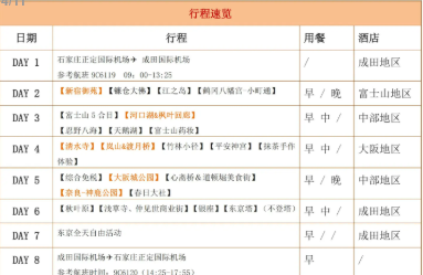 3、报名前需要阅读旅游须知,签补充协议,协议具体内容详见最后一页。 包含项目: 1、春秋航空石家庄/ 东京往返国际机票团队经济舱费用,含机场建设税; 2、日本双人标准间 3、日本旅游巴士费用及日本司机服务(根据实际收客人数,适当调整车型); 4、日本司导及领队服务费 5、行程内所列用餐,日式定食 6、行程中所列景点门票; 7、团队旅游签证费用; 8、赠送旅游意外险 不含项目: 1、护照费用; 2、洗衣,理发,电话,传真,饮料,烟酒,洗熨、付费电视,行李搬运等境外个人消费费用; 3、旅游者因违约、自身过错、自由活动期间内行为或自身疾病引起的人身和财产损失; 4、服务包含项目未提到的其它一切费用。 服务说明: 1、本社有权根据景点关门时间或当地交通状况调整行程游览先后顺序; 2、 日本同北京时间时差为一小时, 日本上午九点, 则北京为上午八点; 3、如遇天气、战争、罢工、地震等人力不可抗力因素无法游览, 我社将按照旅行社协议, 退还没有游览景 点门票费用, 但赠送项目费用不退; 4、游客因个人原因临时自愿放弃游览, 酒店住宿、餐、车等费用均不退还; 5、如遇航空公司政策性调整燃油税费价格, 请按规定补交差价; 包机机票不得改签换人退票; 6、如果旅游目的地国家政策性调整门票或其他相关价格, 请按规定补交差价; 7、我社处理游客意见, 以游客交回的《团队质量反馈表》为依据, 请您秉着公平、公正、实事求是的原则 填写《团队质量反馈表》; 8、 日本的酒店大堂和房间面积相比国内酒店较小, 日本的酒店单人间一般为一张单人床, 单房差是指用一 个单人间产生的差价而非双间单人利用的差价; 9、依照旅游业现行作业规定, 我社有权依据最终出团人数情况, 调整房间分房情况; 10、贵重物品可存放在房间或总台的保险柜里; 住宿之后千万不要把酒店的睡袍带走, 若被发现将严肃处 理; 日本酒店房间分为禁烟房间和准吸烟房间, 在禁烟房间是绝对禁止吸烟的, 准吸烟房间可以吸烟, 但请注意安全; 其他场合必须在有烟灰缸的地方才能吸烟; 禁止厕所吸烟以及把烟头扔入马桶; 若有游客需要吸烟而不知当时场合能否吸烟时请及时询问导游, 避免不必要的误会