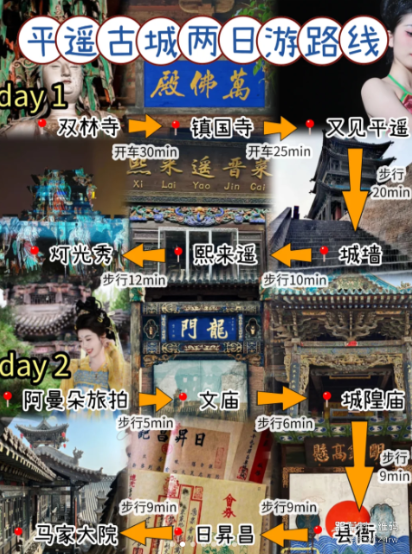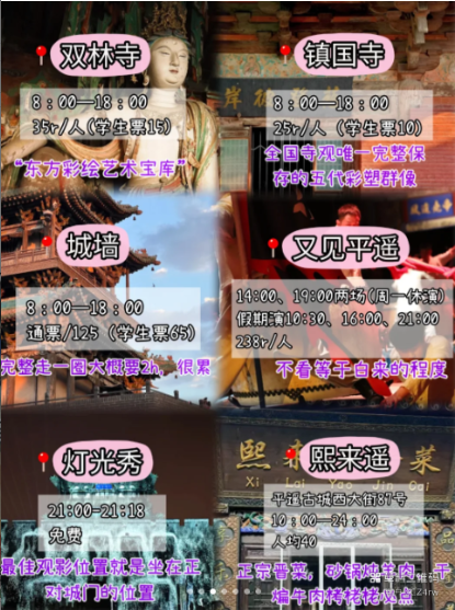 D1: 之后乘车赴平遥,古城始建于西周宣王时期,距今已有2800多年历史。唐代因避北魏太武帝拓跋焘名讳,平陶县改为平遥县,县城亦随之更名。明洪武三年重建、扩修城池,奠定了现存平遥古城的基本格局。1997年,平遥古城与双林寺、镇国寺一同被列入《世界遗产名录》。平遥,抵达后游览【5A平遥古城】夜景,中国古代“华尔街”———明清一条街,探古城民宅、观古城建筑、品古城韵味,穿越历史,走近明清的那一抹繁华。行走在古城大街小巷体验古城味道,了解晋商文化。