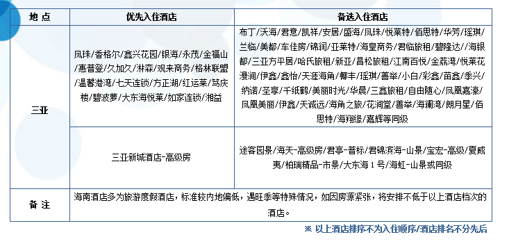 1、海南酒店标准可能会比内地偏低,敬请谅解;如遇旺季酒店资源紧张或政府临时征用等特殊情况,我社有权调整为同等级标准酒店,全程不提供自然单间,如出现单男单女或单人,请补齐单房差或加床(注:加床原则为钢丝床);酒店退房时间为中午12:00时,返程为晚班机的游客可把行李寄存在酒店前台后自由活动或自行开钟点房休息。
