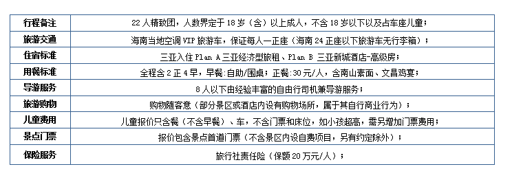 行程特色:0购纯净旅行,热门景区一网打尽,铭记最美时光。饱览迷人风光,深度感受海南的热情与美丽; 精选酒店:三亚入住Plan A三亚经济型旅租、Plan B 三亚新城酒店-高级房; 优选景区:蜈支洲岛5A丨大小洞天5A丨天涯海角5A丨椰海青春纪念园丨南山寺5A丨天堂森林公园(不含观光车)丨玫瑰谷丨后海小镇丨夜游三亚湾(一票通); 精致餐食:品尝与众不同的海南特色美食,含南山素面、文昌鸡宴; 贴心赠送:全程品牌矿泉水、旅行社责任险(保额20万元/人); 品质保障:精选专业导游、耐心解说、贴心细致服务; 接待