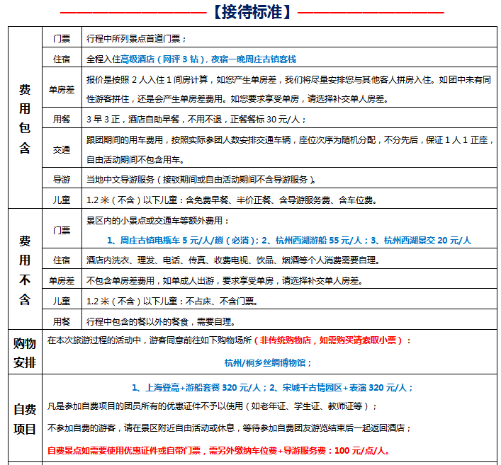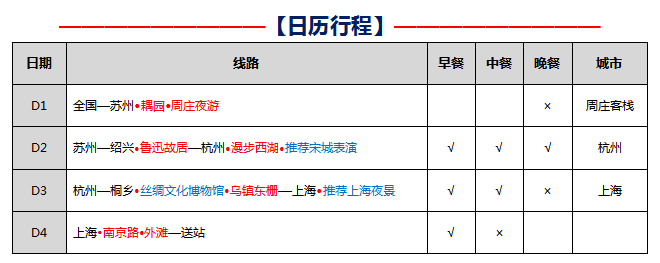 苏沪杭+绍兴鲁迅故居+双水乡周庄&乌镇 <全程入住携程3钻酒店+夜宿1晚江南水乡周庄客栈> 产品特色: 一次游够江南两大王牌水乡周庄、乌镇东栅,深度体验江南水乡文化 品味鲁迅笔下风情,感受鲁迅当年生活情境的真实场所 江南月色,夜游水乡【周庄】,品读不一样的人间烟火 游耦园住佳偶,城曲筑诗城,赏苏州园林的雅致、精巧 精心安排: 全程只进1个丝绸博物馆,让更多的时间去旅行 全程入住携程3钻季度+夜宿一晚周庄古镇客栈,品质有保障 全程餐标30元/人,升级杭州龙井御茶宴