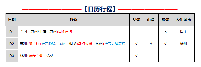 ※ 温馨提示:涉及节假日/周末,西湖风景区大巴车禁止进入,客人需要换乘景区公交车,需包车20元/人,具体当天以现场安排为准。