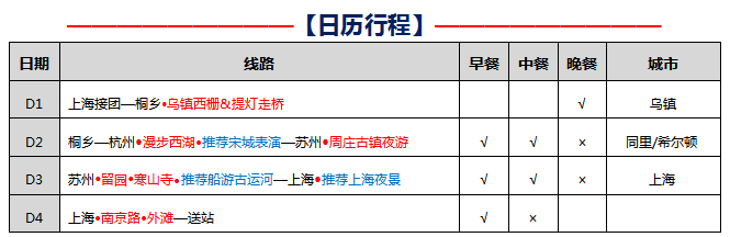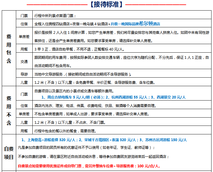 苏州+杭州+上海+夜游二大王牌水乡乌镇西栅&周庄古镇纯玩 <全程入住携程4钻酒店+夜宿1晚水乡乌镇外4钻酒店+升级1晚国际品牌希尔顿酒店>产品特色: 100%真纯玩,无隐形、无套路,全程不进购物店,无忧出游 提灯走桥,深度游览江南二大王牌水乡【乌镇西栅】&【周庄古镇】夜色美景 游江南名园【留园】,体验喧嚣城市中园林山水的那抹静谧 千年古刹【寒山寺】祈福,愿所求皆吾愿、所行化坦途 精心安排: 全程入住携程4钻酒店+夜宿一晚水乡乌镇外4钻+升级一晚国际品牌希尔顿酒店 全程餐标40元/人,赠送乌镇水乡宴