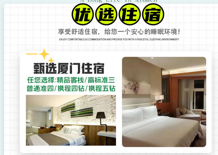 无跟团行程安排,如果您的返程时间尚早,可选择在酒店睡一个小懒觉,舒舒服服的享用美味可口的早餐,餐后可在厦门市区走走逛逛,去走一下攻略爆火的自由行推荐游览地。