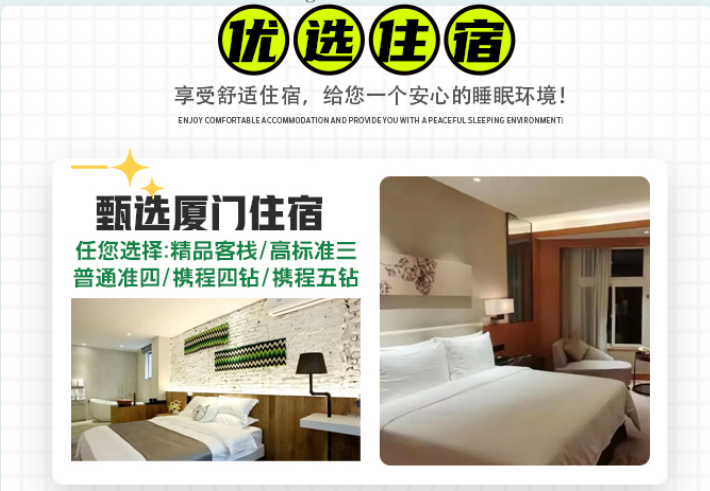 无跟团行程安排,如果您的返程时间尚早,可选择在酒店睡一个小懒觉,舒舒服服的享用美味可口的早餐,餐后可在厦门市区走走逛逛,去走一下攻略爆火的自由行推荐游览地。