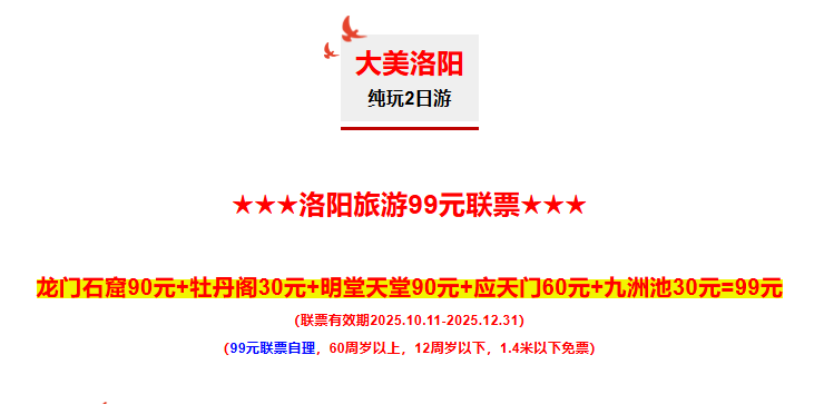 早指定时间地点乘车赴十三朝古都-洛阳,“打卡”热门地标--【洛邑古城】被誉为中原渡口,位于河南省洛阳市老城区。景区包含文峰塔、河南府文庙、妥灵宫、四眼井、金元古城墙遗址等多个历史时期保护建筑,是集游、玩、吃、住、购于一体的综合性人文旅游观光区。游览隋唐洛阳城【明堂天堂】(90元自理,洛阳旅游99元联票包含)明堂即万象神宫,于公元688年建成,位于隋唐洛阳城中轴线上,是宫城(紫微城)的正殿,也是当年唐高宗、武则天一统天下、执掌国柄,沟通天地、感应四时的重要场所。天堂,亦名通天浮屠,始建于公元689年,是武则天时期的皇家御用礼佛堂,也是当时世界上最高的木构架建筑,天堂为外五层内九层,象征武则天九五之尊的历史地位。游览隋唐洛阳城【应天门】(60元自理,洛阳旅游99元联票包含)应天门是隋唐洛阳城宫城的正南门,始建于隋大业元年,也就是公元605年,先后历经隋、唐、五代、北宋四个时期,在南宋绍兴十年公元1140年,被金兵烧毁,沿用530多年之久,是当时朝廷举行重大国事庆典与外交活动的重要场所。应天门规模宏伟,气势浩大,是中国礼制中最能彰显身份和地位的建筑之一,是隋唐两京考古发掘出的第一座宫阙遗址,在1990年的第三次考古发掘中,首次发现隋唐两京的“双向三出阕”,是当时发现的隋唐洛阳城中保存最好的一处遗址,是目前发现的全国等级最高的城门遗址,被评为当年全国十大考古发现。游览隋唐洛阳城【九洲池】(30元自理,洛阳旅游99元联票包含)九洲池位于隋唐洛阳城宫城西侧,始建于隋,历经隋、唐、五代和北宋时期。设计者宇文恺引谷水入园,利用自然水源创造九洲池水景。史载:“其池屈曲,象东海之九洲,居地十顷,水深丈余,鸟鱼翔泳,花卉罗植”,为未成年的皇子、公主居住之地,是帝后休憩、享受天伦之乐之所,沿袭了自汉代以来皇家园林“一池三山”的基因,显示了“天人合一”的建造理念。晚入住宾馆。