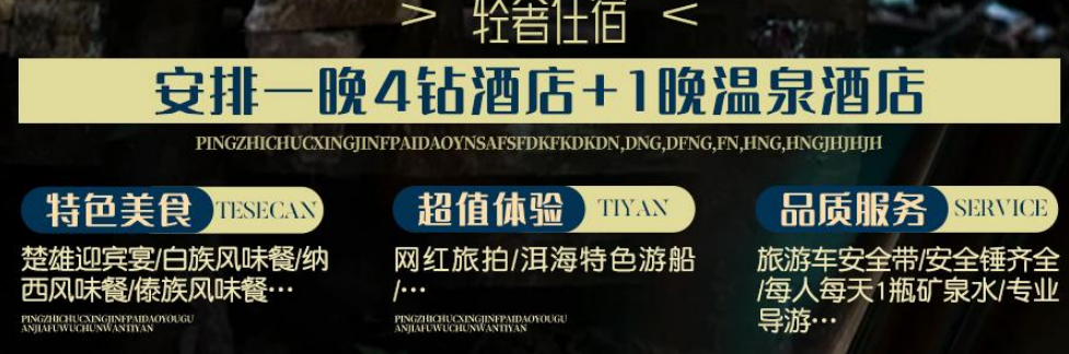 昆明酒店:唐高尔夫度假酒店、云安会都水晶宫、国贲、郎玺、凡叶、喆啡、璞见、高原明珠酒店、希诺 酒店、铭春国际假日酒店、徽商酒店、致远国际酒店、维也纳酒店、喆啡酒店、铭春花园温泉度假酒店、 云琪温泉或同级 楚雄酒店:凯天、海悦、君博、皓玉假日酒店、升宝酒店、舒心美居酒店、金色天华酒店、温楚酒店、玉 波 酒店、蝶恋花印象、世纪星大酒店、文鼎酒店金水印象、宏强、红屋副楼、尚城普标、福星、金水印象、 宏强或同级 大理酒店:蓝水温泉、俪水温泉、兴丽源、 鑫达酒店、龙源温泉、龙云、南亚大酒店、索亚大酒店、云江 智能、晚约精品酒店、柏菲假日、地质酒店、泰昕大酒店、博奥盈科、烁辉酒店、栖遇酒店林恋酒店、世 纪风情、云之尚酒店、双红酒店、新环球商务酒店、连城酒店、维多利酒店、云能畅酒店、绿春源、丽水, 冰霞,美哒、龙江温泉、 怡心园或同级 丽江酒店:大恒别院、丽鼎假日酒店、鹏程酒店、丽春酒店、润福居酒店、玉潭酒店、玉璧峰酒店、白龙 潭酒店、美域酒店、吉钰酒店、绿韵酒店、蓝亚假日酒店、鸿壹笔酒店、康伟酒店、俊云酒店、花景月下 酒店、增楼富乐酒店、喜来福酒店、 景汇、锦尚、新盛、虎跳峡主楼、宴泰、溪龙、鑫海、云庭城市酒店, 仙居大酒店、联强酒店,龙潭湾假日酒店,丽悦酒店,古漫酒店或同级 版纳酒店:亦诚国际,上源国际,城航,鑫盛时代,华美达副楼,云禾园、告庄喆啡,滨港国 际或同级 昆明返程酒店:云都温泉酒店、联邦四季酒店、秋恋温泉酒店、中旺温泉大酒店、格威斯温泉酒店、华德 酒店、铭春花园温泉酒店、云美酒店、香拉温泉酒店、金柏温泉酒店、迦南酒店、观海湾、亿都国际 天苑 温泉酒店、云恒酒店、友华之星酒店、华都华昌店、鸿润酒店、金悦酒店、佳信明珠酒店、承鸿商务酒店、 星河酒店、航艺花园酒店或同级 ★以上参考酒店无法接待的情况下,我社可选择其他酒店,但标准不低于上述酒店。 ★春节期间(2 月 1 日-2 月 20 日)暑假、国庆等旺季期间,昆明首住酒店调整为:联邦四季酒店、秋恋温 泉酒店、中旺温泉大酒店、格威斯温泉酒店、华德酒店、铭春花园温泉酒店、云美酒店、香拉温泉酒店、 金柏温泉酒店、迦南酒店、观海湾、亿都国际或同级