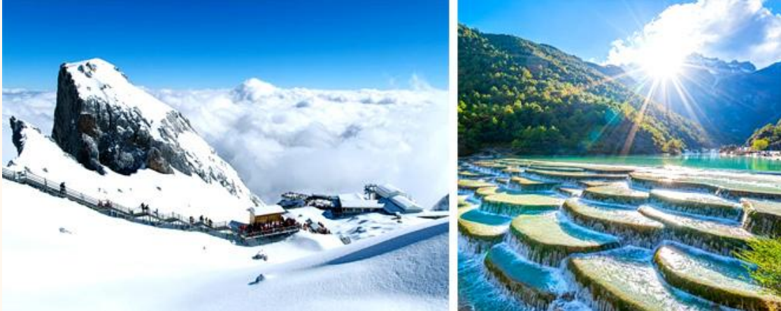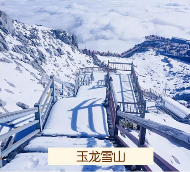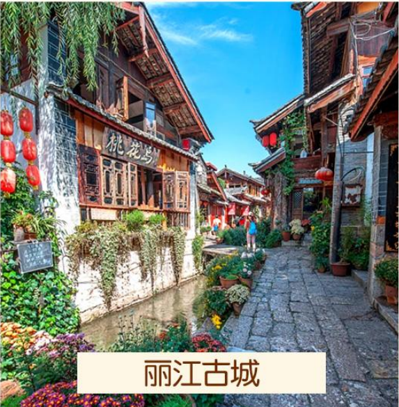前往云南省特色艺术小镇,中国民间艺术之乡【新华银匠村】,村子是依原生态自然村落建成的,是一 个典型的白族寨子。走在镇子中,随处可见正在加工手工艺品的村民,叮叮咚咚的锤打声不绝于耳,“家家 有手艺,户户是工厂,一村一业,一户一品”。更有近百位非遗传承人,以精湛的技艺,用手工敲打出一件 件具有很高观赏价值和使用价值的民族用品。 中餐后乘车前往北半球离赤道最近且终年积雪的山脉【玉龙雪山】,坐【玉龙雪山·云杉坪索道】饱览 玉龙雪山风光,原始树木郁郁葱葱,雪山诸峰千姿百态,相互映衬,心旷神怡是你此时最好的感受。穿越 一片原始森林,你会看到又高又直的云杉,一棵连着一棵,林海茫茫。 游览“小九寨”【蓝月谷】(不含电瓶车 60 元/人)。谷内的白水河晴天时河水是蔚蓝的,阴雨天时是白色的, 流淌在玉龙雪山峡谷的白水河,宛若人间仙境。 乘车前往【丽江古城】(自由游览)。古城小桥流水,粉墙瓦黛,山水为脉,流云为神,在灰白分明的 纳西卯榫老建筑和沟渠水草间,透着让人沉醉的古韵。漫步古城,除了鼓声、音乐声、风铃声,时不时传 来一阵阵年轻姑娘银铃般的笑声、老阿妈咯咯咯的笑声,温顺的小柴犬、小猫咪就哪都不去,横在门口, 一起徜徉在丽江的柔软的时光中! 丽江古城自由活动结束之后,自行前往酒店。