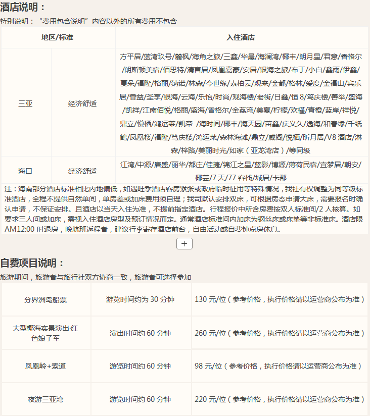 1. 接送机温馨提醒:(1)接机人员一般会提前在机场接机口等候,请您下飞机后务必及时开机,保持手机畅通;经与工作人员核实信息后,同个航班的客人接到即乘车前往酒店;( 2)在自由活动期间请注意安全,掌握好时间,并保持手机畅通以便工作人员联系您,免得耽误回程赶飞机的时间;(3)第一天到海南请勿食用过多热带水果及大量海鲜,以防肠胃不适,影响您后面的行程! 2. 折扣机票,不可退票、改签,请成人带好有效证件,儿童带好户口本;航班抵达前24小时以内取消合同的客人需收车位费200元/人。 3. 我们承诺绝不减少餐标,但海南饮食口味清淡,且海南物价水平较高,且各团队餐厅菜式比较雷同,未必能达到您的要求,建议您可自带些咸菜或辣椒酱等佐餐。旅游期间切勿吃生食、生海鲜等,不可光顾路边无牌照摊档,忌暴饮暴食,应多喝开水,多吃蔬菜水果,少抽烟,少喝酒。因私自食用不洁食品和海鲜引起的肠胃疾病,旅行社不承担经济赔偿责任。 4. 行程当中约定景点等其它项目(非赠送、升级类),如遇不可抗力因素造成无法履行,仅按游客意愿替换或按团队采购成本价格退费,并有权将景点及住宿顺序做相应调整;行程当中关于赠送、免费升级等项目,如遇不可抗力因素或因游客自身原因无法实现及自愿放弃的,均不退费、不更换。 5. 特别提示:岛屿类(蜈支洲岛、分界洲岛、西岛等)景区规定60岁以上及行动不便游客(包括孕妇)需填写景区的免责声明方可登船上岛;70周岁以上老年人出于安全考虑,景区不予接待。 6. 行程中标注的时间可能因堵车、排队等情况有所不同;部分景区团队旅游可能会排队等候,因等候而延误或减少游览时间,游客请谅解并配合。因排队引发投诉旅行社无法受理。 7. 非本公司组织安排的游览活动,旅游者自行承担风险。由此发生的损失及纠纷,由旅游者自行承担和解决,旅行社不承担任何责任。夜间或自由活动期间宜结伴同行并告知导游,记好导游手机号备用,注意人身和财物安全。贵重物品可寄存在酒店前台保险柜,下榻的酒店的名称位置也要记牢,不要随便相信陌生人,特别是三轮摩托车、街头发小广告者,天下没有免费的午餐。 8. 行程中部分景区或酒店内设有购物商店,属于自行商业行为,并非我社安排的旅游购物店,此类投诉我社无法受理,敬请谅解;如需新增购物或参加另行付费的旅游项目,需和地接社协商一致并在海南当地补签相关自愿合同或证明,敬请广大游客理性消费。 9. 因报价已提供综合优惠,故持导游、军官、残疾、老人、教师、学生等优惠证件的客人均不再享受门票减免或其它优惠退费。 10. 我社“0购”产品绝不增加行程外购物店,如有异议游客可在海南旅游过程中与我社客服人员进行的沟通解决,若行程已结束,回到出发地再提异议或投诉,我社概不受理;在法律允许范围内,最终解释权归海南地接社所有。 11. 因本线路较为特色,如当日参团人数不足8人,我社将为您提供两种选择方案:(1)免费升级相关同类产品(不低于原线路成本价值);(2)通过您委托当地旅行社代租自驾游车辆,我社派专职司机兼导游为您全程服务;如有异议请慎重选择,敬请理解! 12. 海南气候炎热,紫外线照射强烈,雨水充沛,请带好必备的防晒用品、太阳镜、太阳帽、雨伞,尽量穿旅游鞋,应避免穿皮鞋、高跟鞋。为防止旅途中水土不服,建议旅游者应自备一些清热、解暑的药或冲剂等常用药品以备不时之需,切勿随意服用他人提供的药品。海南是著名的海滨旅游胜地,请自备拖鞋、泳衣泳裤等。且需注意人身安全,请勿私自下海。 13. 文明旅游、文明出行,自觉爱护景区的花草树木和文物古迹,不随意在景区、古迹上乱涂乱画、不乱丢垃圾、尊重当地少数民族风俗等。很多景区和酒店周边有小摊小贩,如无意购买请不要与其讲价还价,一旦讲好价格不购买的话容易产生矛盾。出游请保持平常的心态,遇事切勿急躁,大家互相体谅、互相帮助。 14. 请如实填写当地《游客意见书》,游客的投诉诉求以在海南当地由游客自行填写的意见单为主要依据。不填或不实填写,归来后的投诉将无法受理,如在行程进行中对旅行社的服务标准有异议,请在海南当地解决(24小时客服热线:0898-66677719),如旅游期间在当地解决不了,应在当地备案。温馨提醒:旅游投诉时效为返回出发地起30天内有效。 |