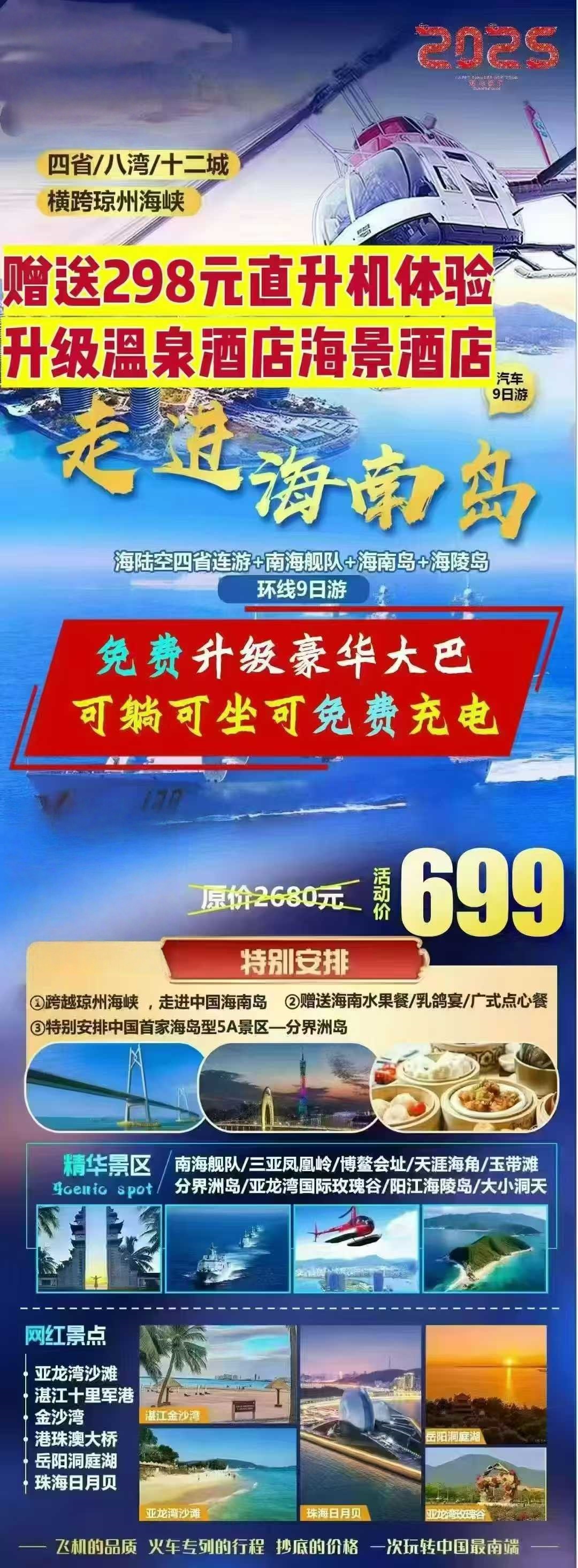 涵盖 贺州温泉/跨海轮渡/直升机体验/博鳌亚洲论坛成立会址/三亚天涯海角/凤凰岭/南山大小洞天/玉带滩/石梅湾/海陵岛/珠海渔女像/日月湾/港珠澳大桥/中英街/深中隧道/洞庭湖·汴河街/韶山