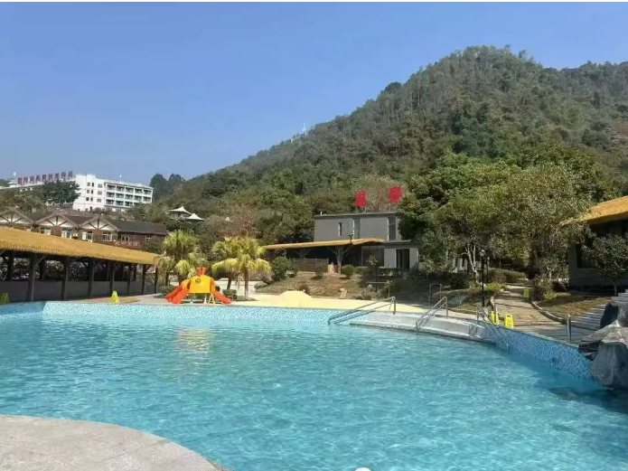 温泉景区属于姑婆山山脉,三面环山,一面临溪,瀑飞溪潺,层林叠翠,负氧离子含量高,自然生态环境优越,温泉地热资源十分丰富,泉水流量为120吨/小时,水温常年达60℃泉水中主要含有特殊的“”元素,含达到 47ME,已达到优质医疗温泉级别,除此之外含有偏硅酸、氟化物、硫、铁、锌、锰等 38种矿物质,无论从成分、含量、水温和出水量各项因素综合评判都可称为优质温泉水,被称为“超级复合型温泉”