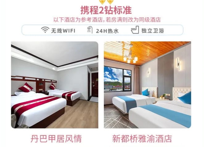■酒店:所列住宿地 6 晚住宿,双床房每人 1 床位,大床房和三人间在川西地区很稀有,大床房和三人间不能保证安排。
