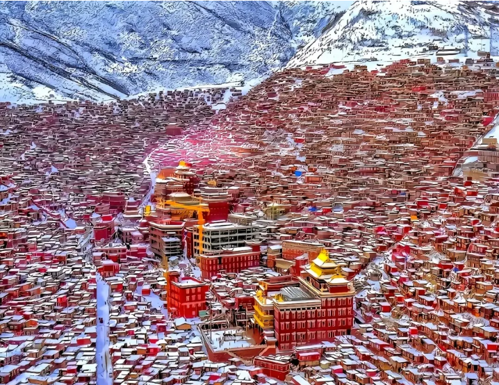 色达平均海拔3900米,占地面积4平方公里,寺院建筑群占地2.35平方公里,建筑面积约1.7平方公里。是世界上最大的藏传佛学院之一,这里的僧舍很壮观,连绵数公里的山谷布满了密密麻麻的小木棚屋。谷底和山梁上分布着几座寺庙和佛堂,建筑规模虽都不很大,但装饰考究而辉煌;身披桨红色僧袍的喇嘛和尼姑来来往往,空气中充满生机和祥和气氛。
