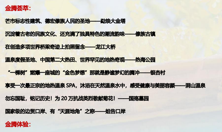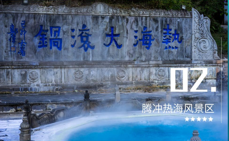 酒店享用早餐后,前往参观国家一级口岸【姐告国门】姐告口岸在距离瑞丽市区东南 4 公里, 瑞丽江的东岸.面积 1.92 平方公里,与缅甸木姐镇紧紧相连, 是瑞丽市跨江唯一的村镇,陆路 直接与缅甸相连,历史上称为"飞地"。前往中缅两国最具特色的边境村寨【一寨两国】,这里 有着一寨两国,一桥两国,一井两国,一塔两国,一秋荡两国,1950 年周恩来总理到此定下了 中缅 71 号界碑,为中缅两国边界及胞波情怀奠定了世代友好基础,互利共赢的历史性意义。后 乘车前往中国翡翠第一城、中国人的心灵故乡-腾冲,之后游览【热海公园】(不含景区往返电 瓶车 15 元/人)在这里你会亲眼看到云南十八怪之鸡蛋栓着卖,蛤蟆嘴、珍珠泉、姐妹泉,怀 胎井、热海石、大滚锅、浴谷、美女池等构成,最高水温达 102 度,是中国地热疗养的最佳之地。气泉热泉很多,其中最为壮观的便是大滚锅。晚餐特别安排当地特色养生腾药宴,晚餐后 建议自费观赏诠释腾冲人文历史和民俗风情的大型原生态歌舞表演,边城绝唱-《梦幻腾冲》, 后入住酒店休息