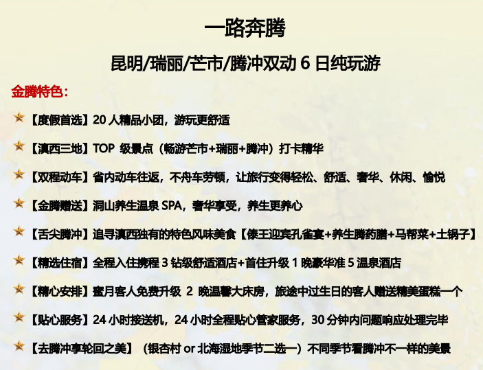 尊贵出行:正规旅游空调车,确保车辆安全,车内整洁,司机规范,确保一人一正座,控制在 15 %的空座率 舒适升级:双程动车,不舟车劳顿,让旅行变得轻松、舒适、奢华、休闲、愉悦 金牌导游:专线专导,知识丰富,趣味十足,服务周到热情,懂得云南全方位的知识性导游!
