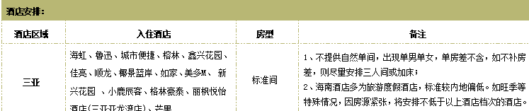1、海南酒店标准比内地偏低,请旅游者提前做好心理准备。如遇旺季酒店资源紧张或政府临时征用等特殊情况,我社有权调整为同等级标准酒店。酒店的退房时间为中午的12:00,返程为晚班机的旅游者可把行李寄存在酒店前台后自由活动或自行开钟点房休息。我司默认安排双床,夫妻情侣可根据房态免费申请大床,需要报名时确认申请,不保证安排。且酒店以当天入住为准,不提前指定酒店。行程报价中所含房费按双人标准间/2人核算。如要求三人间或加床,需视入住酒店房型及预订情况而定,通常酒店标准间内加床为钢丝床或床垫等非标准床。