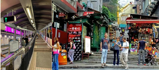乘坐半山扶梯(约 10 分钟):从中环的遮打街开始,搭乘世界最长的户外 有盖自动扶梯——中环至半山自动扶手电梯。扶梯全长约 800 米,垂直高差 达 135 米,沿途可欣赏中环的街景和城市风光。