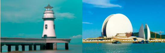日月贝 :外观中国唯一建设在海岛上的歌剧院。珠海大剧院由一大一小两组“贝壳”组成,构成了歌剧院的整体形象,因此得称“日月贝”。