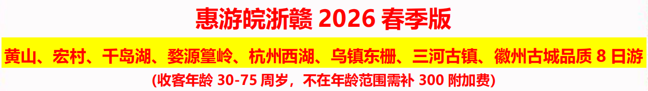 8 大 5A 豪华景点阵容,一次旅行,终生难忘! 5A 震旦国中第一山 ——黄山, 领略“四绝”奇观,人间仙境! 5A 中国画里乡村——宏村,走进诗画徽州,水墨江南! 5A 天下第一秀水——千岛湖,船游绿水青山金腰带,放松身心! 5A 梯田花海,晒秋人家——婺源篁岭,赏全球十大最美梯田,开启春天的浪漫! 5A 中国最美的水乡——浙江乌镇,梦里水乡,来过便不曾离开! 5A 中国十大风景名胜——杭州西湖,漫步苏堤,醉美人间天堂! 5A 江南四大古镇之一——三河古镇,5A 中国四大古城之一——徽州古城, 超值推荐:来黄山必看的大型实景演艺《徽秀》,感受波澜壮阔的奇幻之旅视听盛宴! 升级美食:含 5 早 4 正,升级 1 餐徽州风味宴,品尝臭鳜鱼毛豆腐,有偿赠送千岛湖鱼头宴