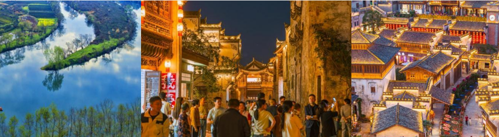 途径婺源竹筏体验点,可体验小小竹排江中游,魏巍青山两岸走的【闪闪红星竹筏】(自费套餐内赠送),后前 往游览【婺源月亮湾】月亮湾是去李坑的路上路过的一个小岛,星江河至此刚好一个孤形拐弯,河中间有个类似的岛, 象弯弯的月亮,故而得名月亮湾。春天的月亮湾,白墙、黑瓦、金花、绿水在一片朦胧中更加亦幻亦真,宛如一张中国 水墨山水画,后前往婺源乡村客栈入住休息(江西提倡环保,不含空调和一次性洗漱用品,请提前自备)。后前往游览 【弦高古城】(门票免,游览约 1 小时) 前往婺源县城,西湖荡街区前身为南宋时期赵宗沆修砌的“婺源西湖”——曾 以“桃李映荷”闻名。改造过程中保留了大量徽派水建、水宅、水街巷、水城墙和水系,使用传统的飞檐翘角和木雕、 砖雕、石雕技艺恢复徽派民居,通过复原曲水回旋及街、巷、里、弄、胡同、牌坊等,再现徽商鼎盛时期弦高镇的热闹 繁华与市井烟火。夜幕下马头墙倒映睡眠,沿湖悬挂非遗鱼灯,千米灯阵如一夜鱼龙舞,霓虹与徽派飞檐交织,赛博朋 克和传统美学碰撞,后入住婺源区域酒店休息。(遇油菜花旺季会根据实际情况调整到黄山市区住宿)