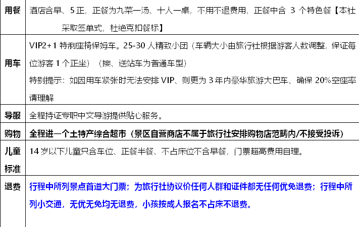 7、若因客人自身原因导致不能正常走完行程或者提前离团 ,无任何退费 ,需按实际产生费用结算