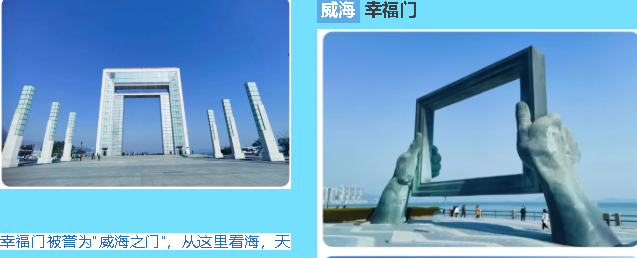 抵达后游览获建筑鲁班奖的威海港公园、威海海滨最高点【幸福门外景】,正对世昌大道,整栋建筑呈“门”字型,着重体现威海城市发展的历史轨迹和开放、发展的城市形象。这座建筑之所以称做幸福门,是因为幸福门正好是威海千公里幸福海岸线的起点
