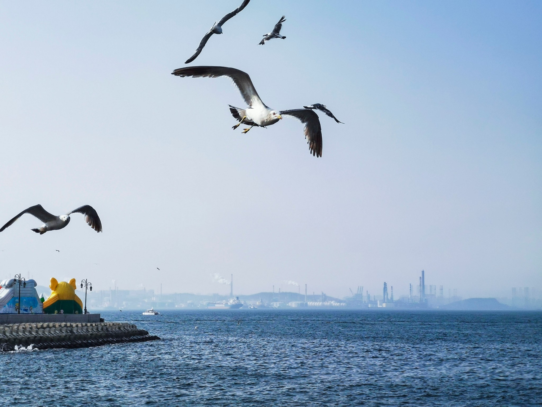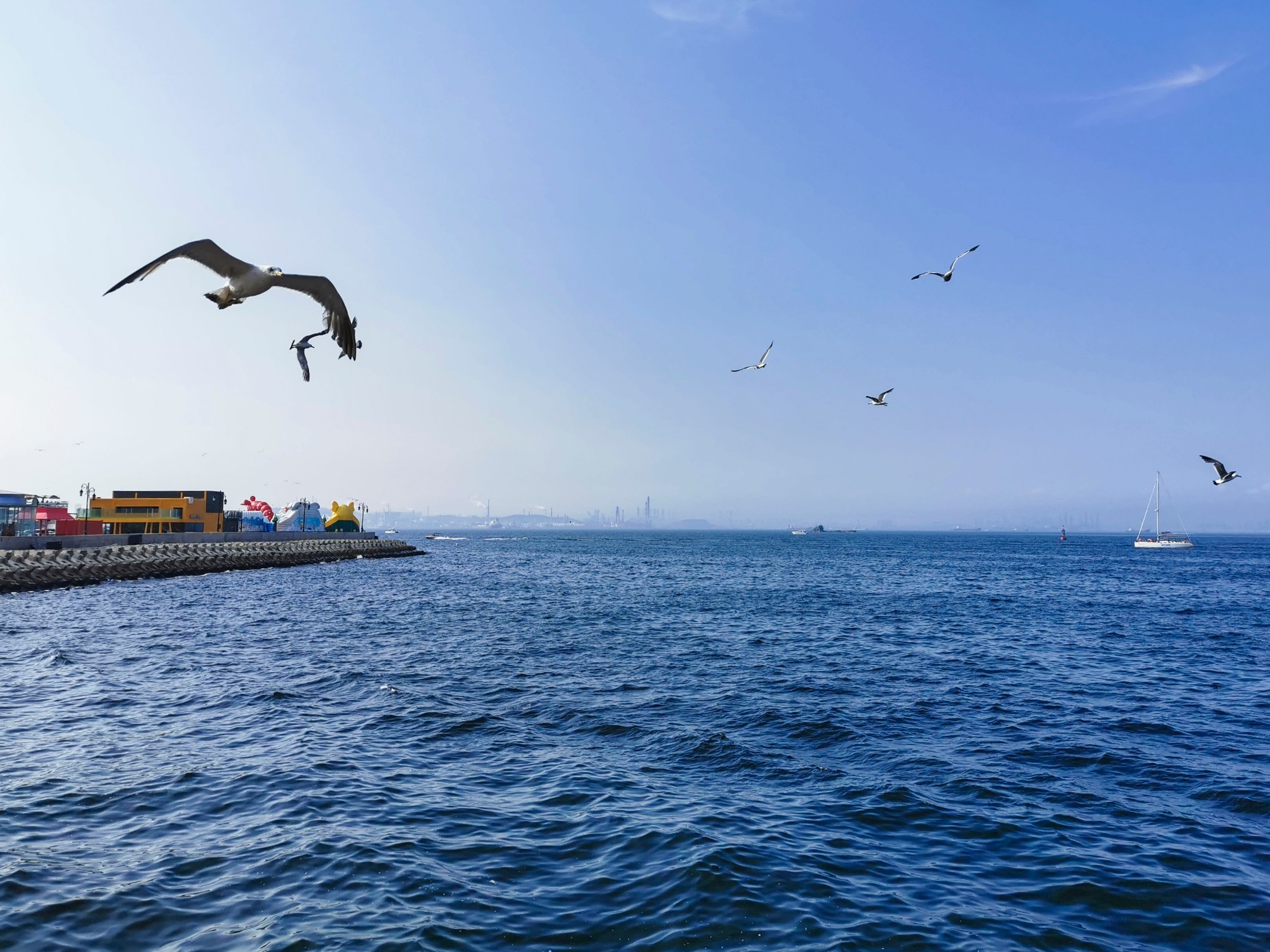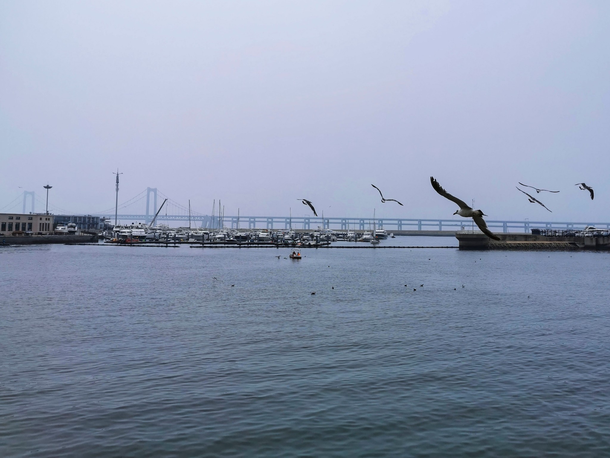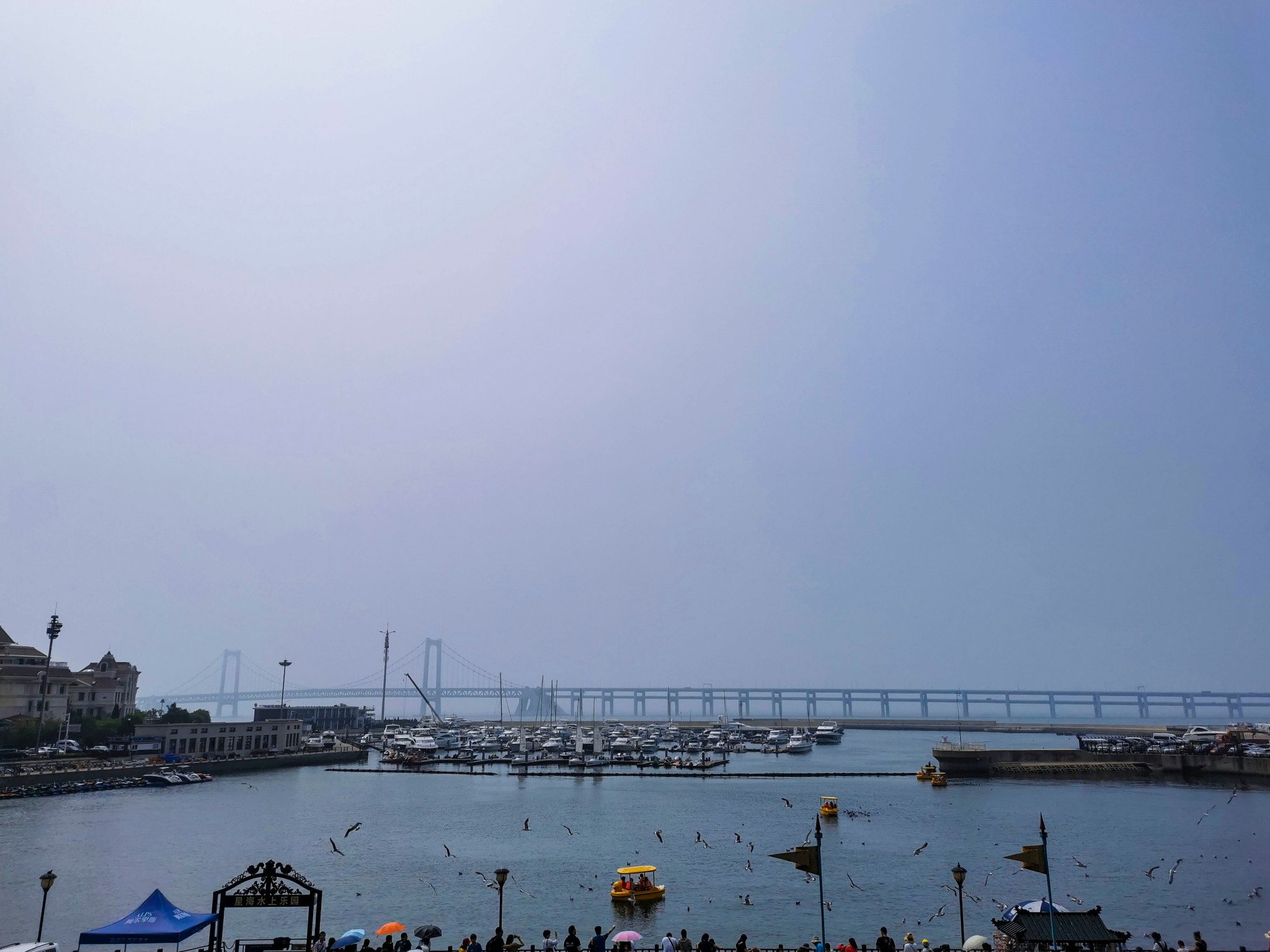 出来后站在二层平台上,可以看看远处的星海湾大桥,看看海鸥。