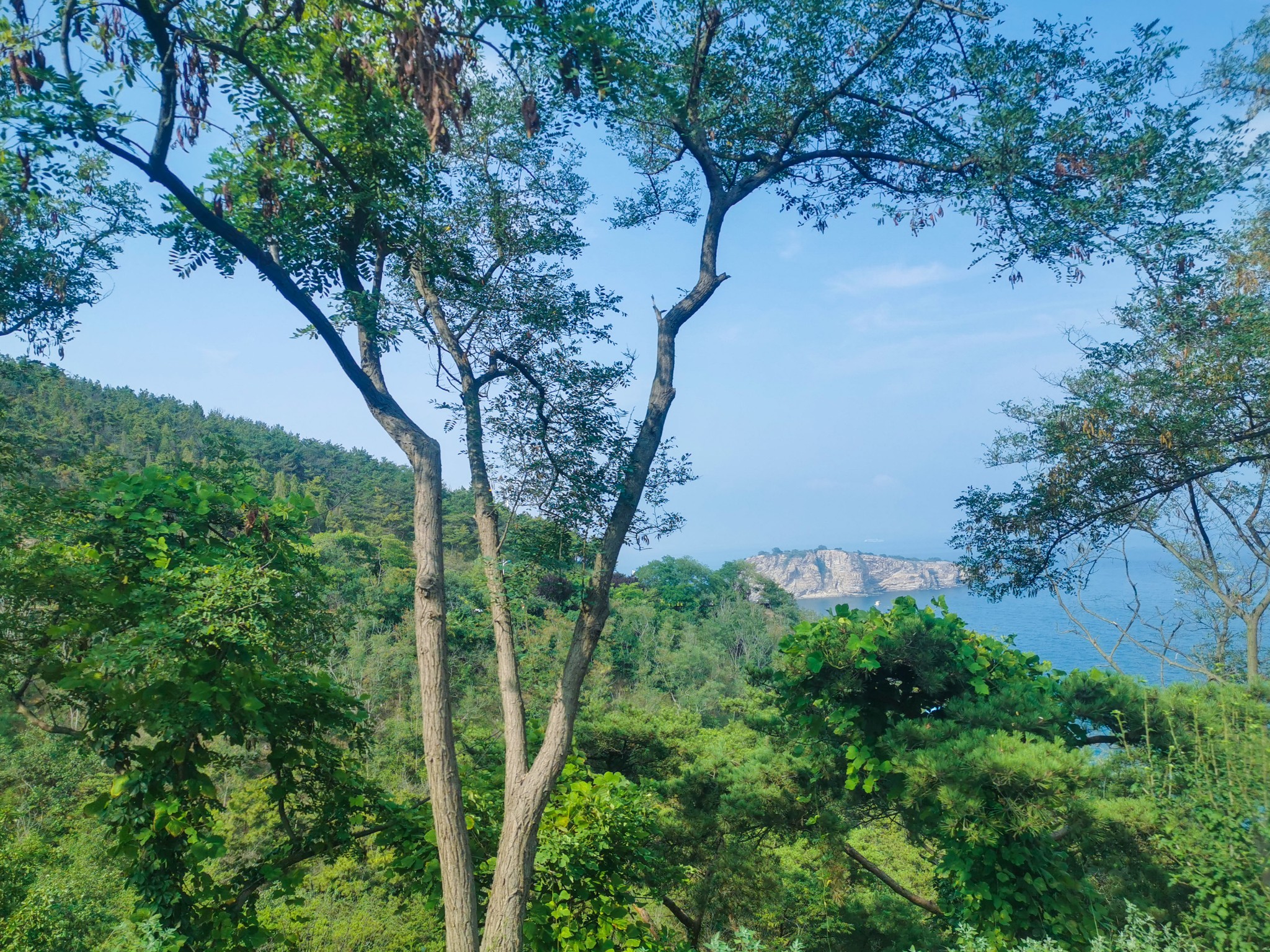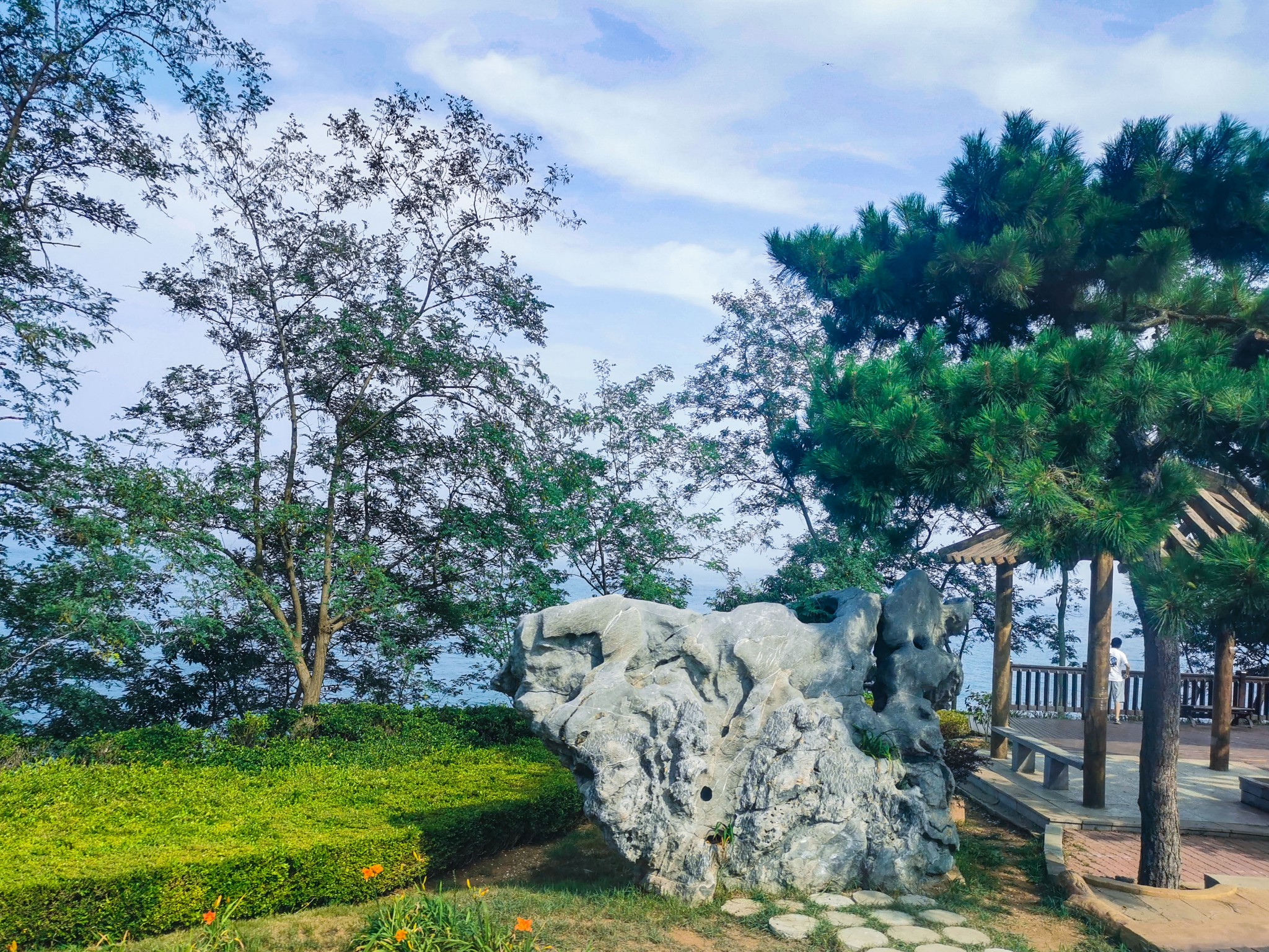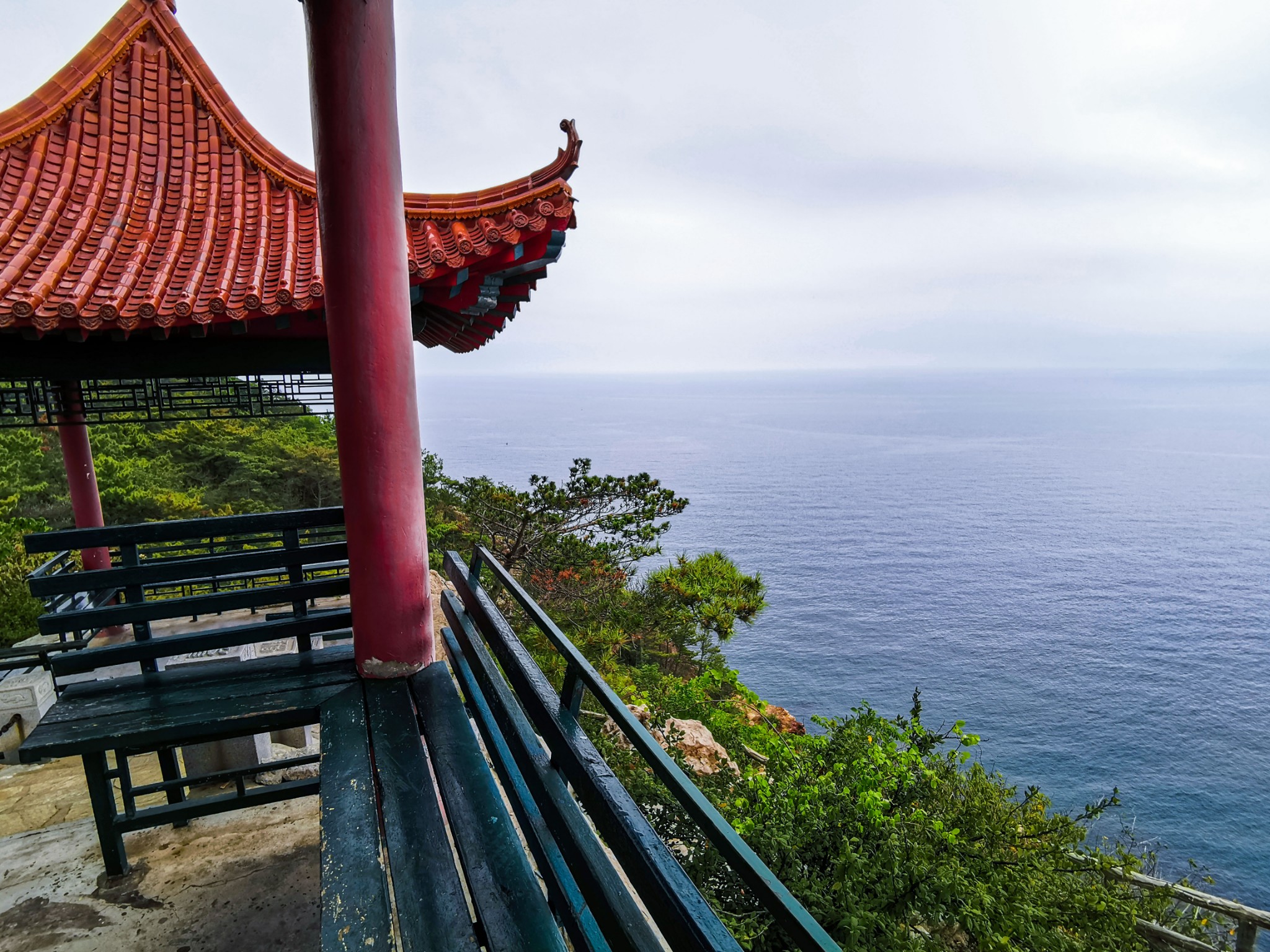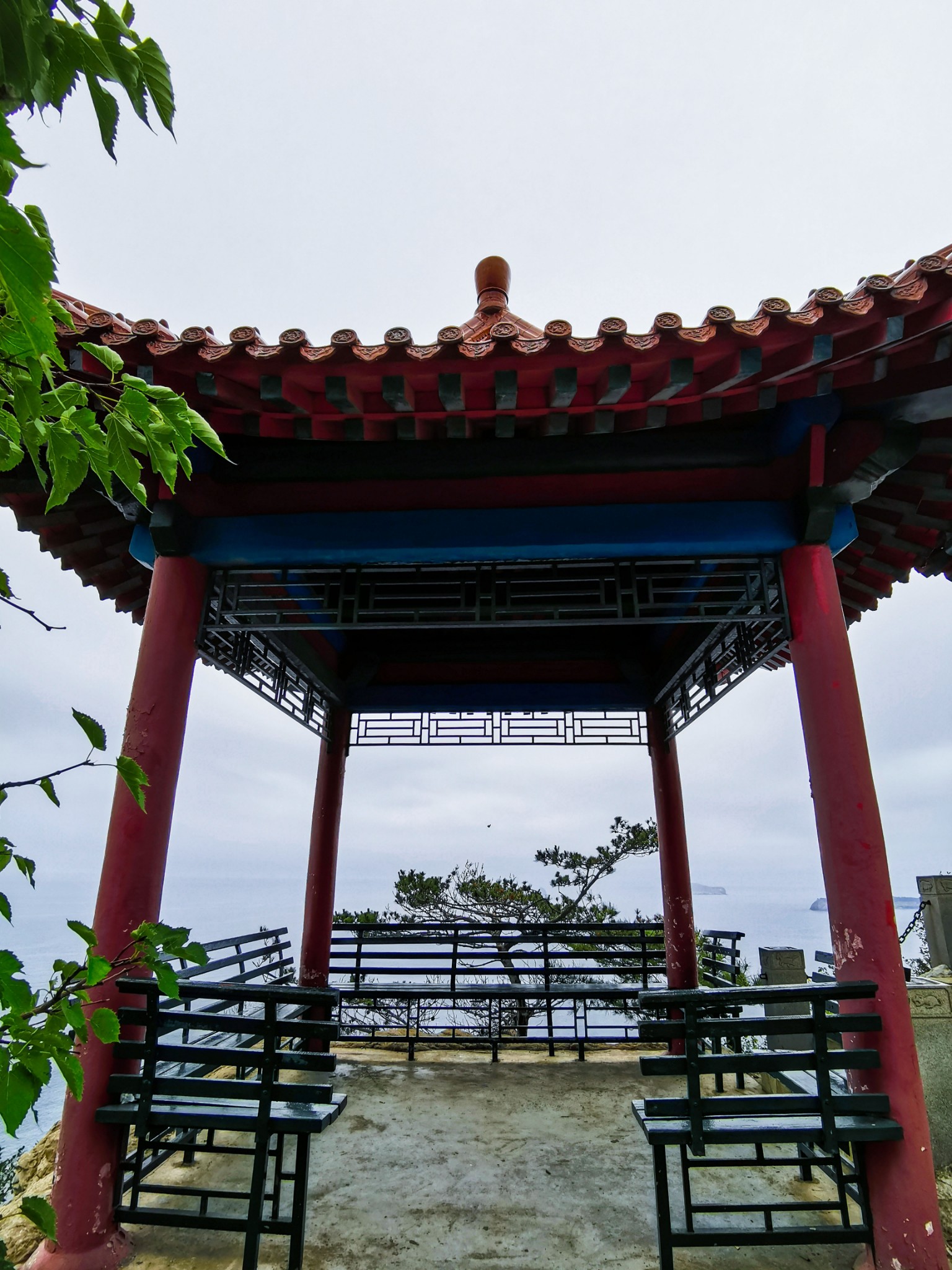 燕窝岭婚庆公园在山上,往西走有两个亭子,此处视野开阔,是看海的好地方。