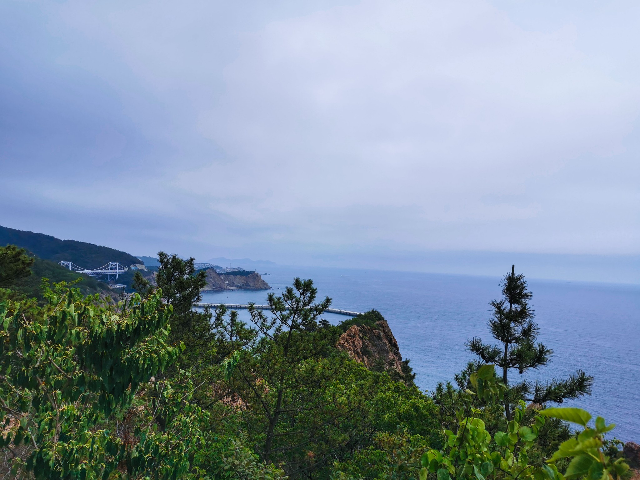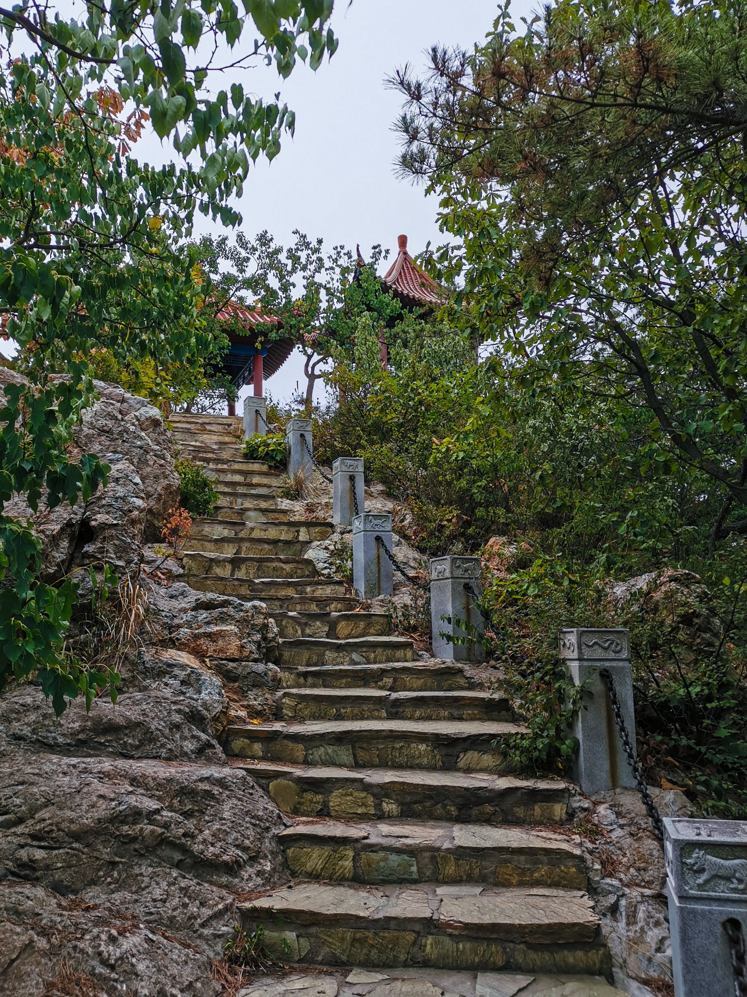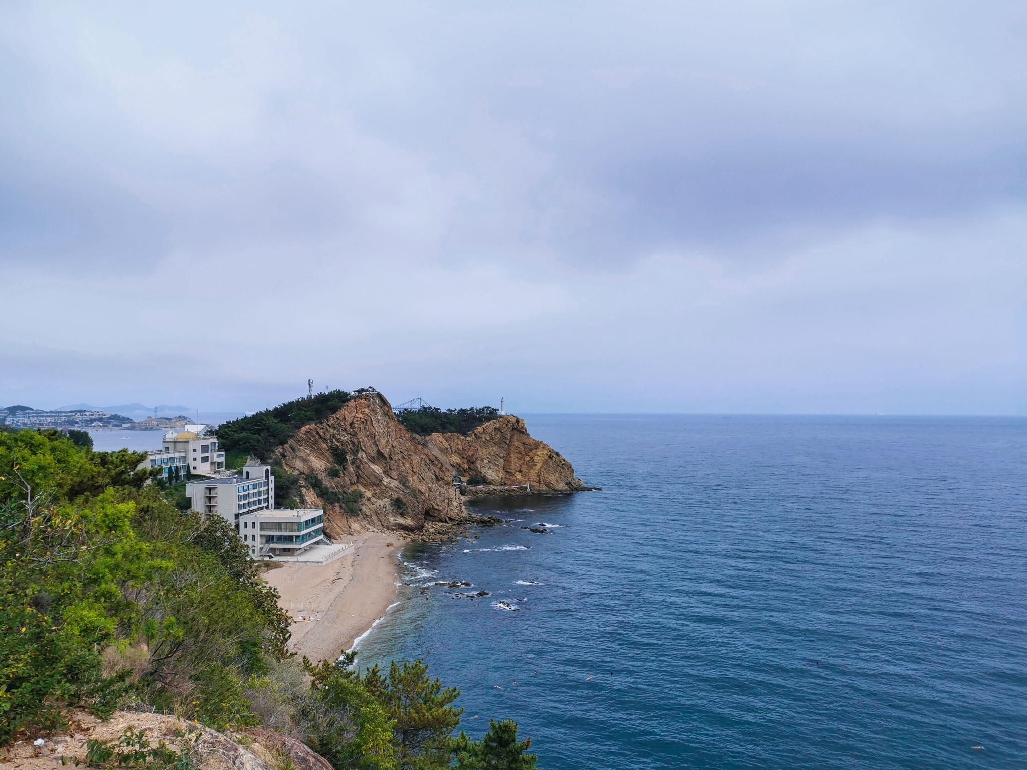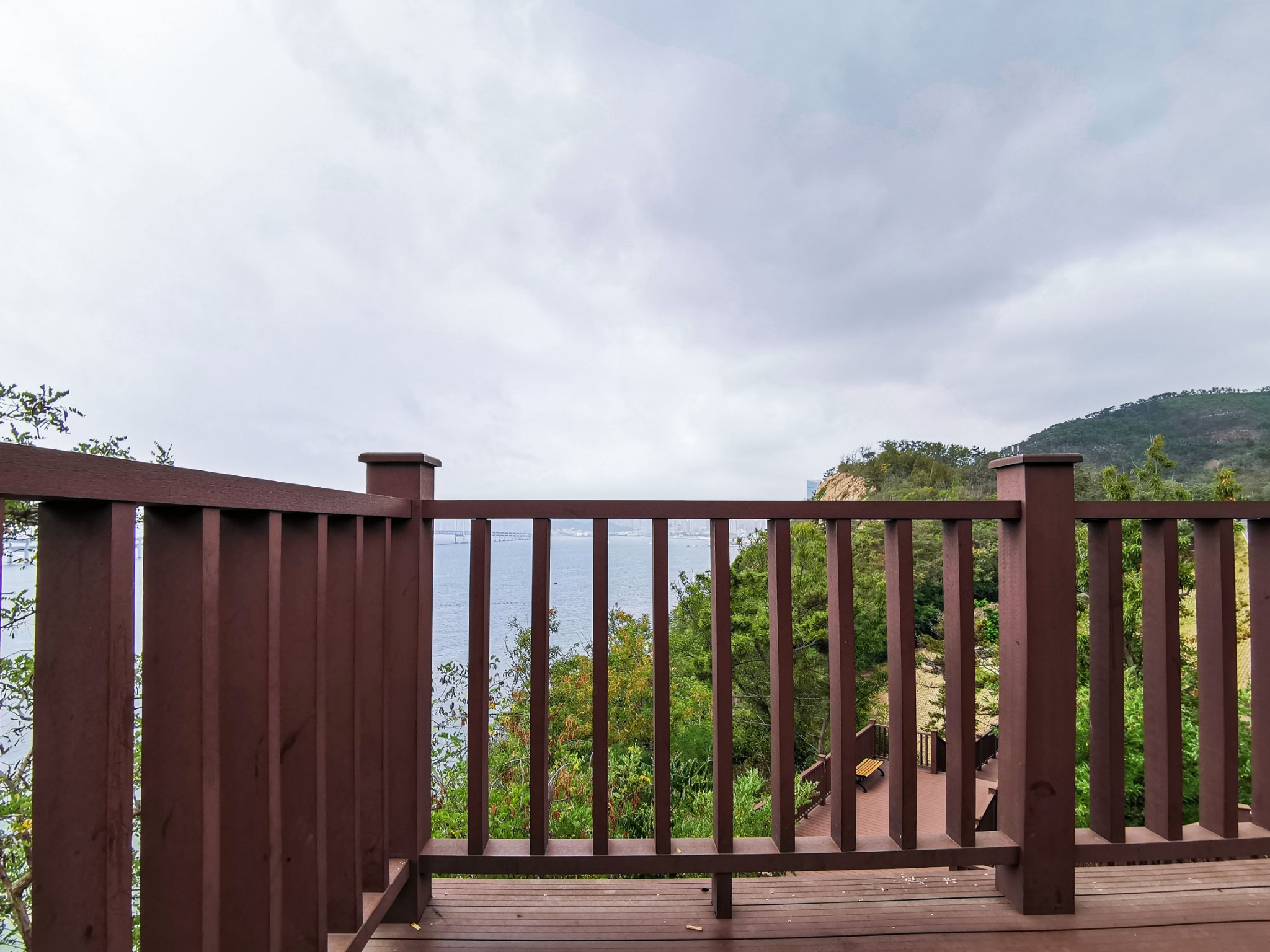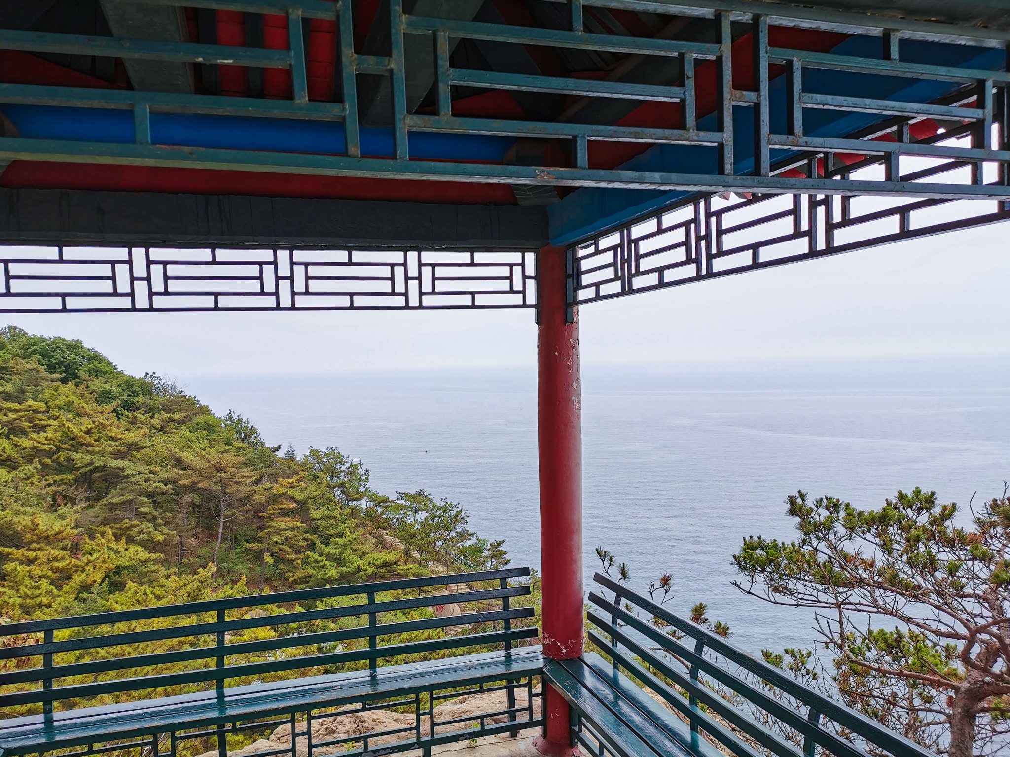 燕窝岭婚庆公园在山上,往西走有两个亭子,此处视野开阔,是看海的好地方。
