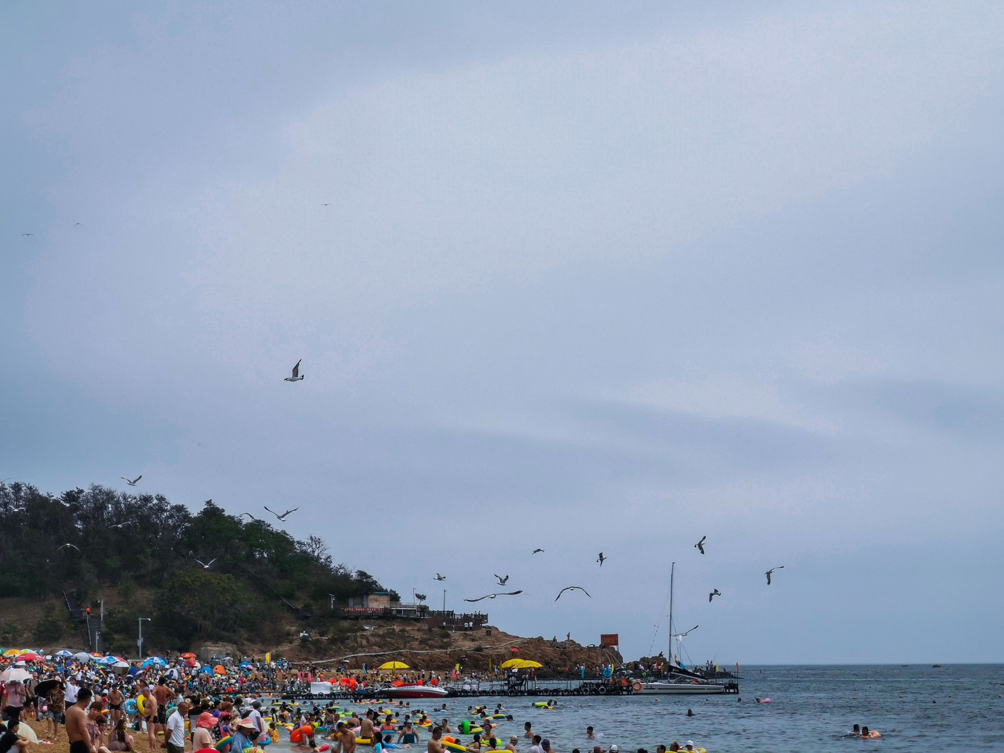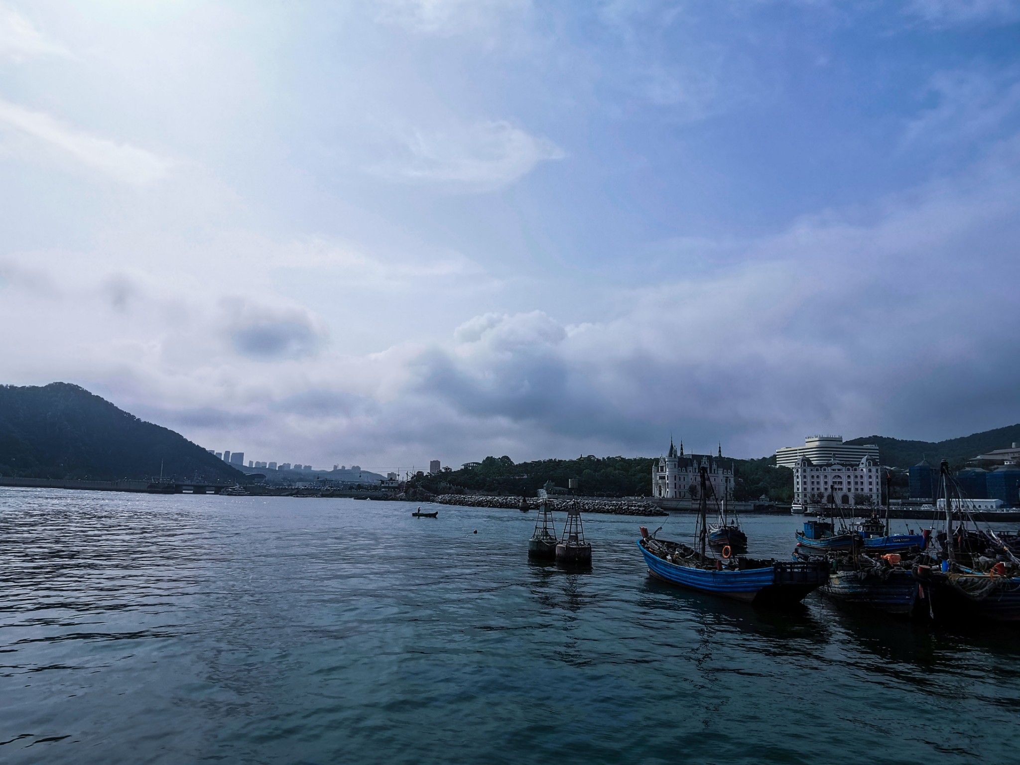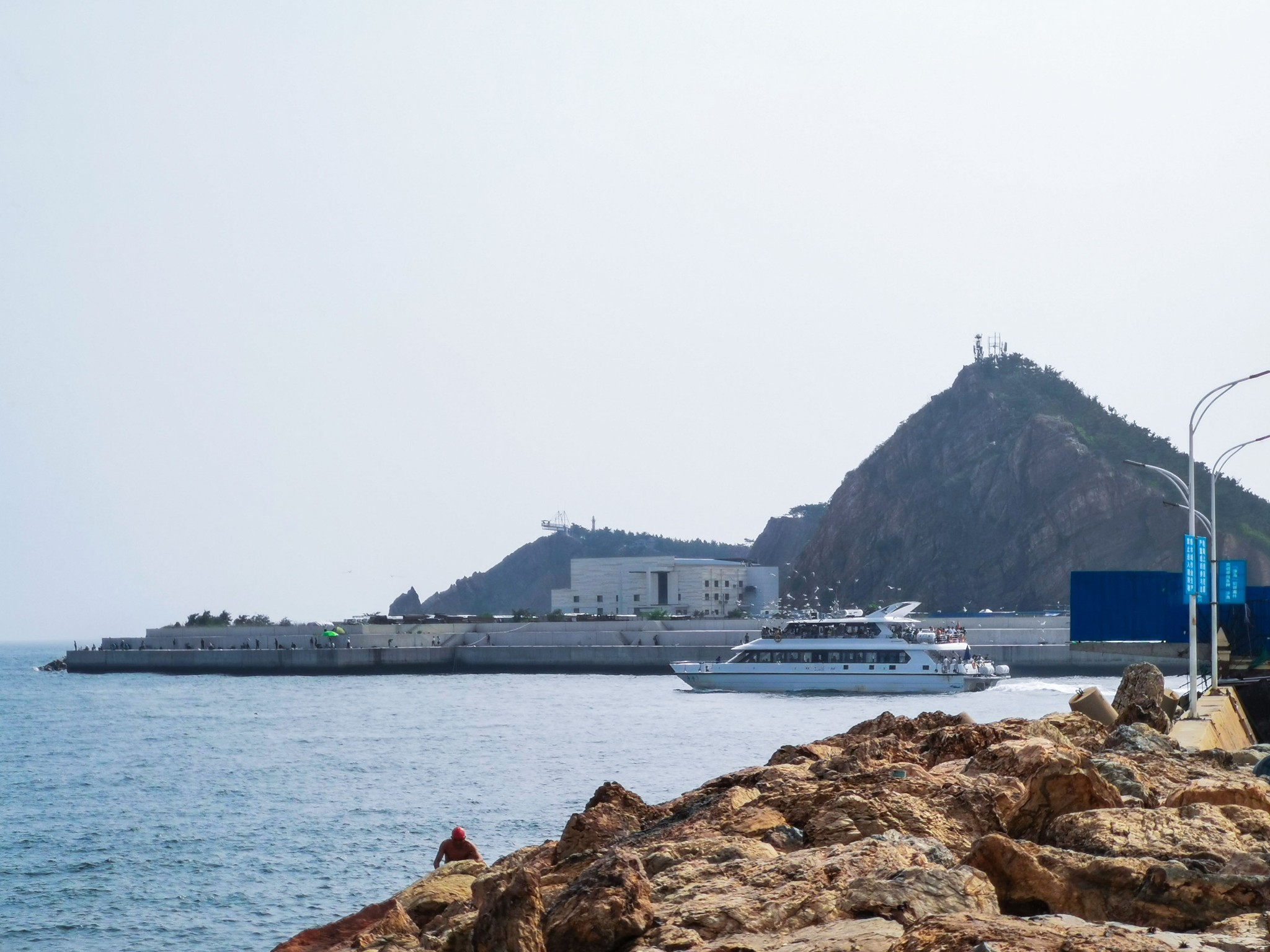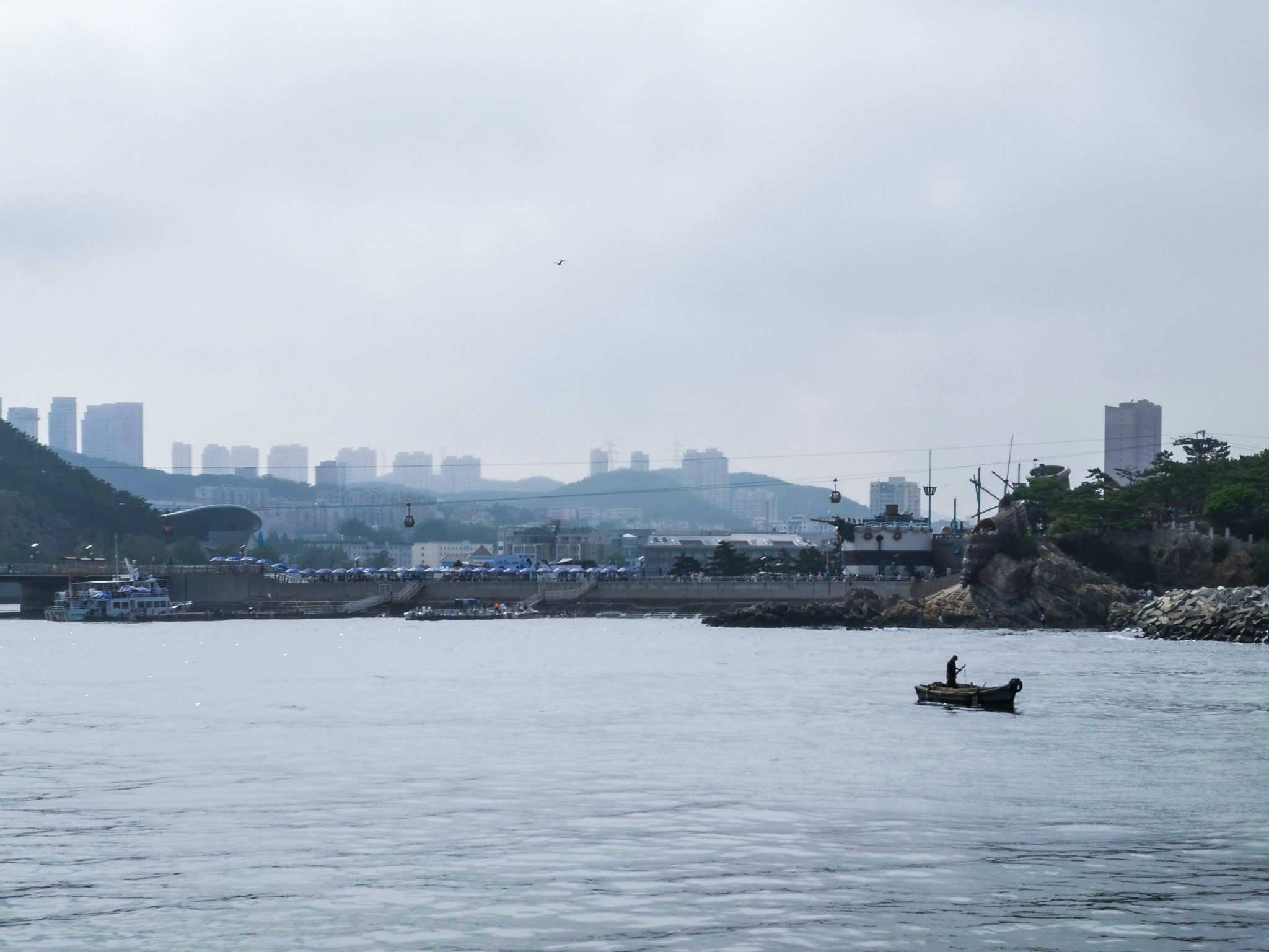 下车后就看见一排排 新建 的仿欧式建筑,不免有些失望,但沿着路穿过建筑,才来到了真正的码头。码头上停满了渔船,此处可以乘坐游船出海喂海鸥游览。沿着栈道走,竟见到一群老大爷裸泳。 ̄^ ̄゜
