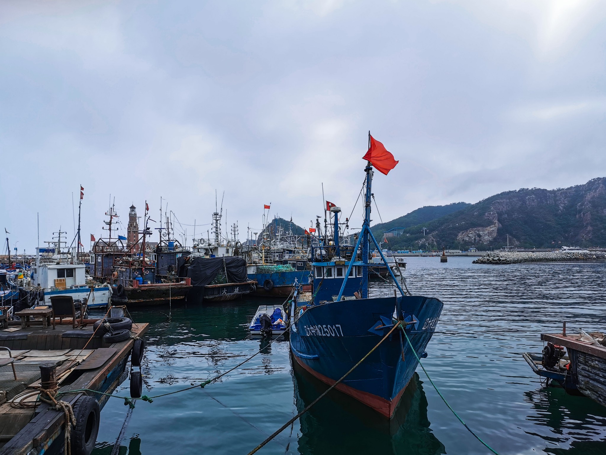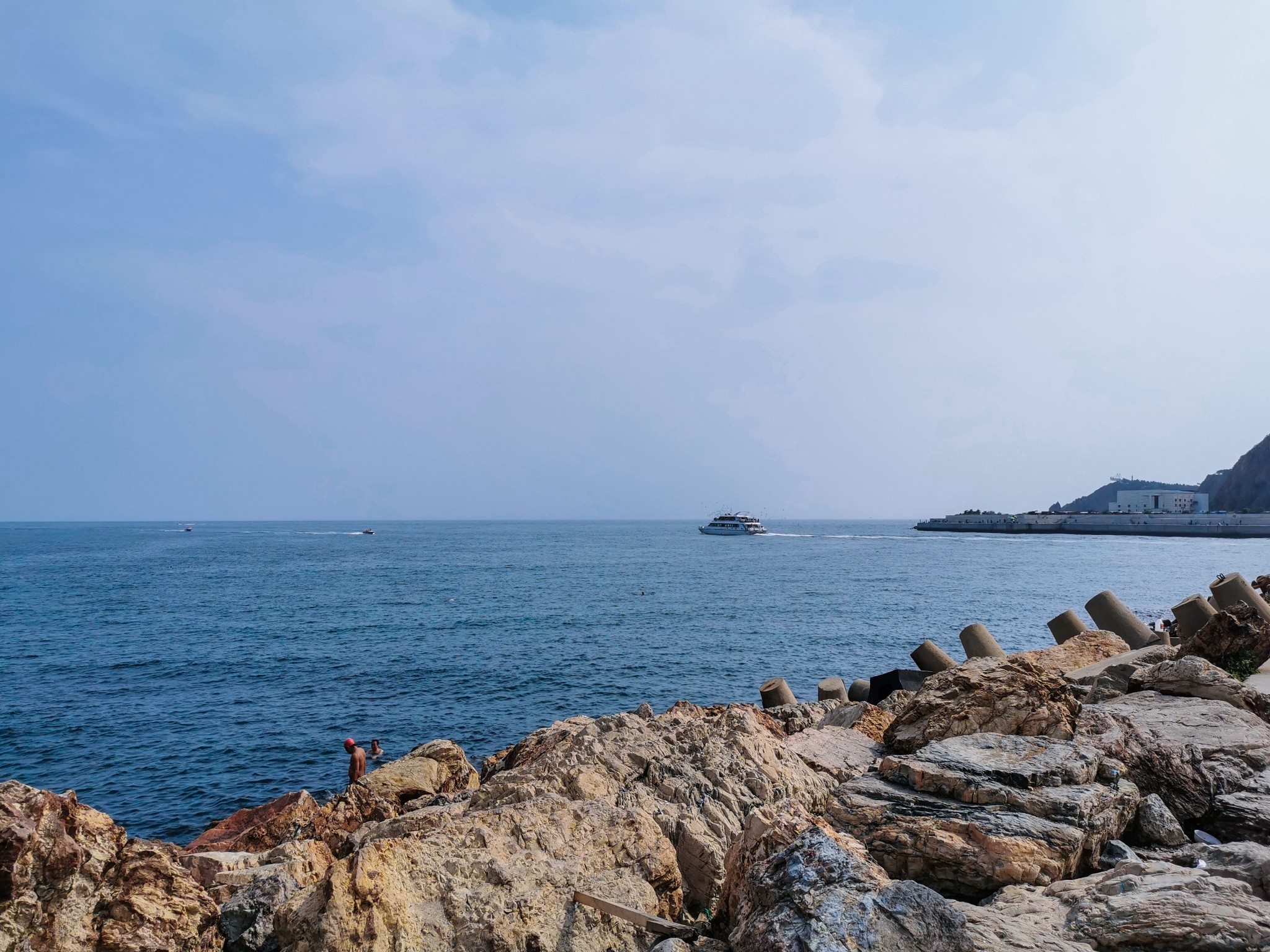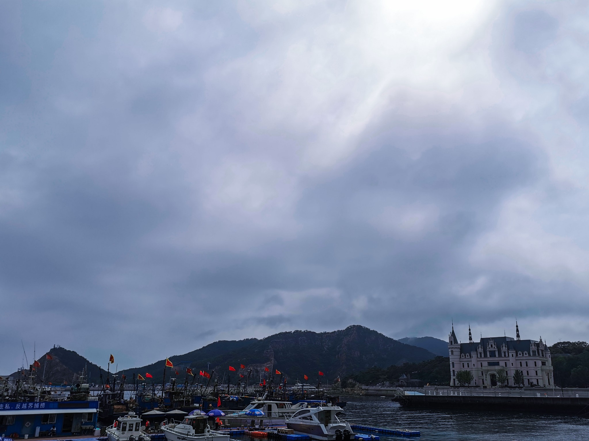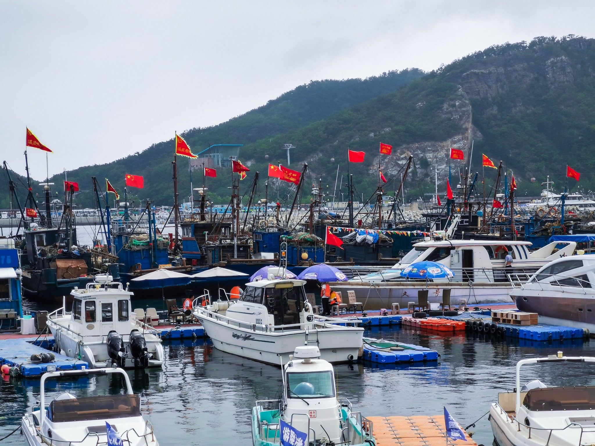 下车后就看见一排排 新建 的仿欧式建筑,不免有些失望,但沿着路穿过建筑,才来到了真正的码头。码头上停满了渔船,此处可以乘坐游船出海喂海鸥游览。沿着栈道走,竟见到一群老大爷裸泳。 ̄^ ̄゜