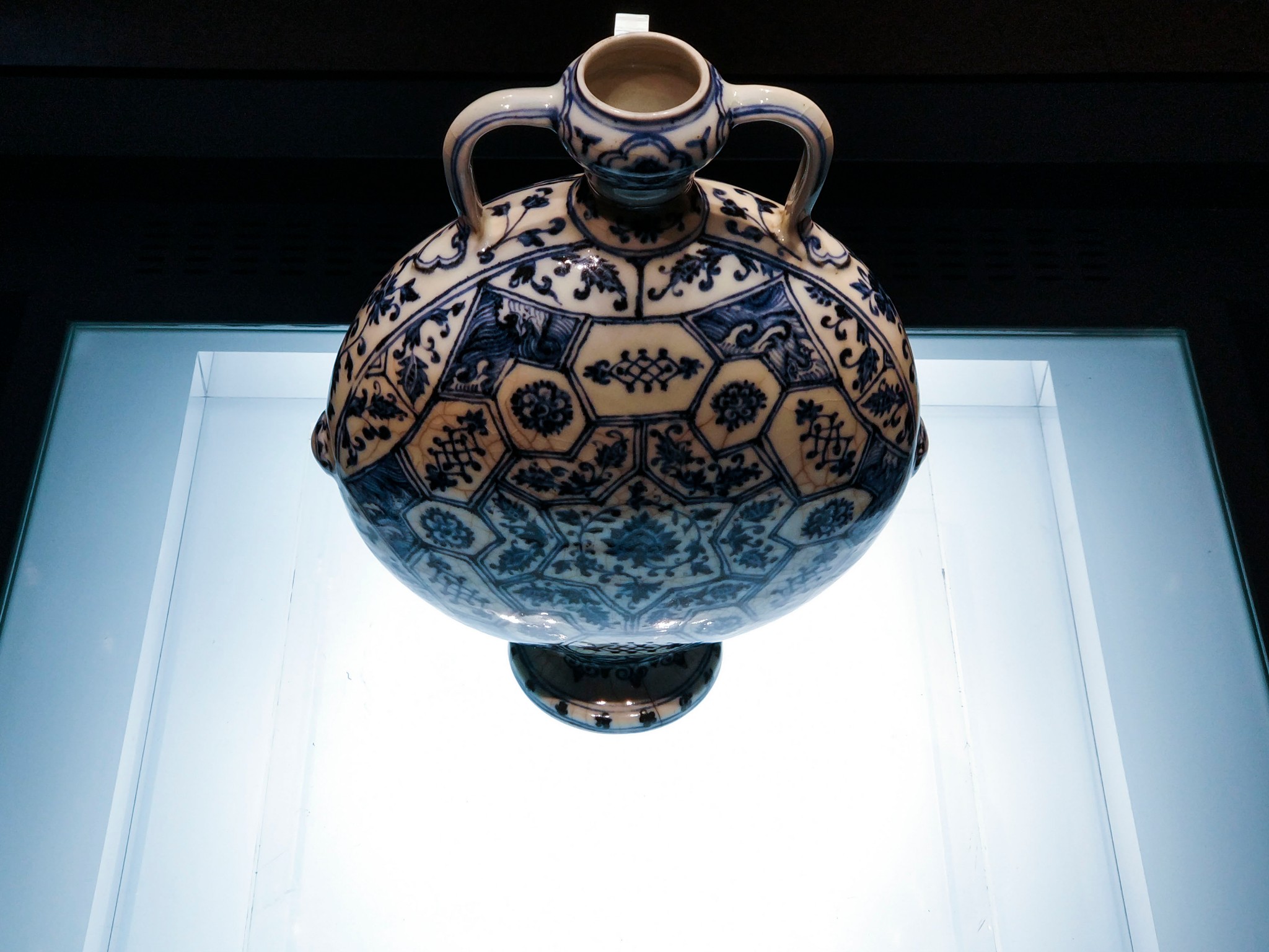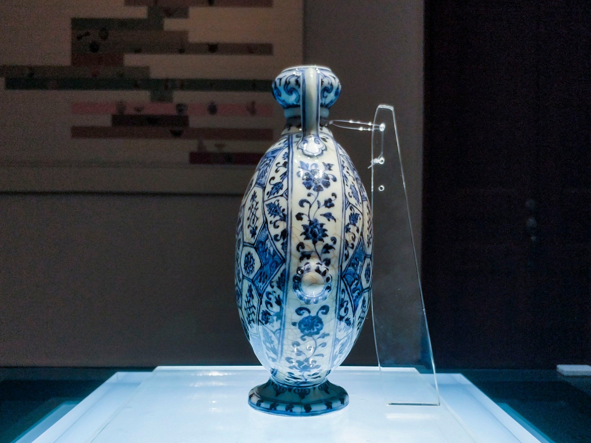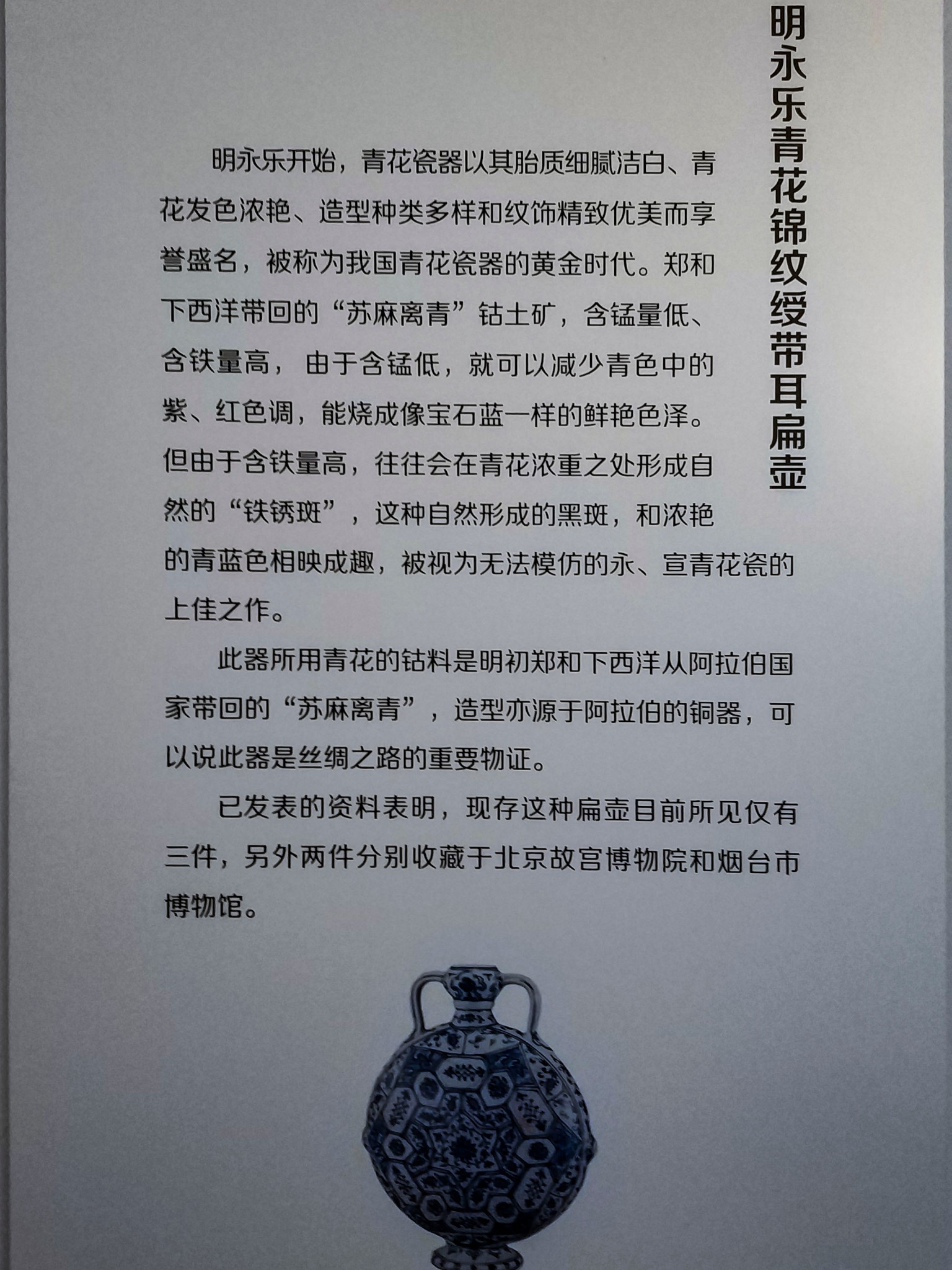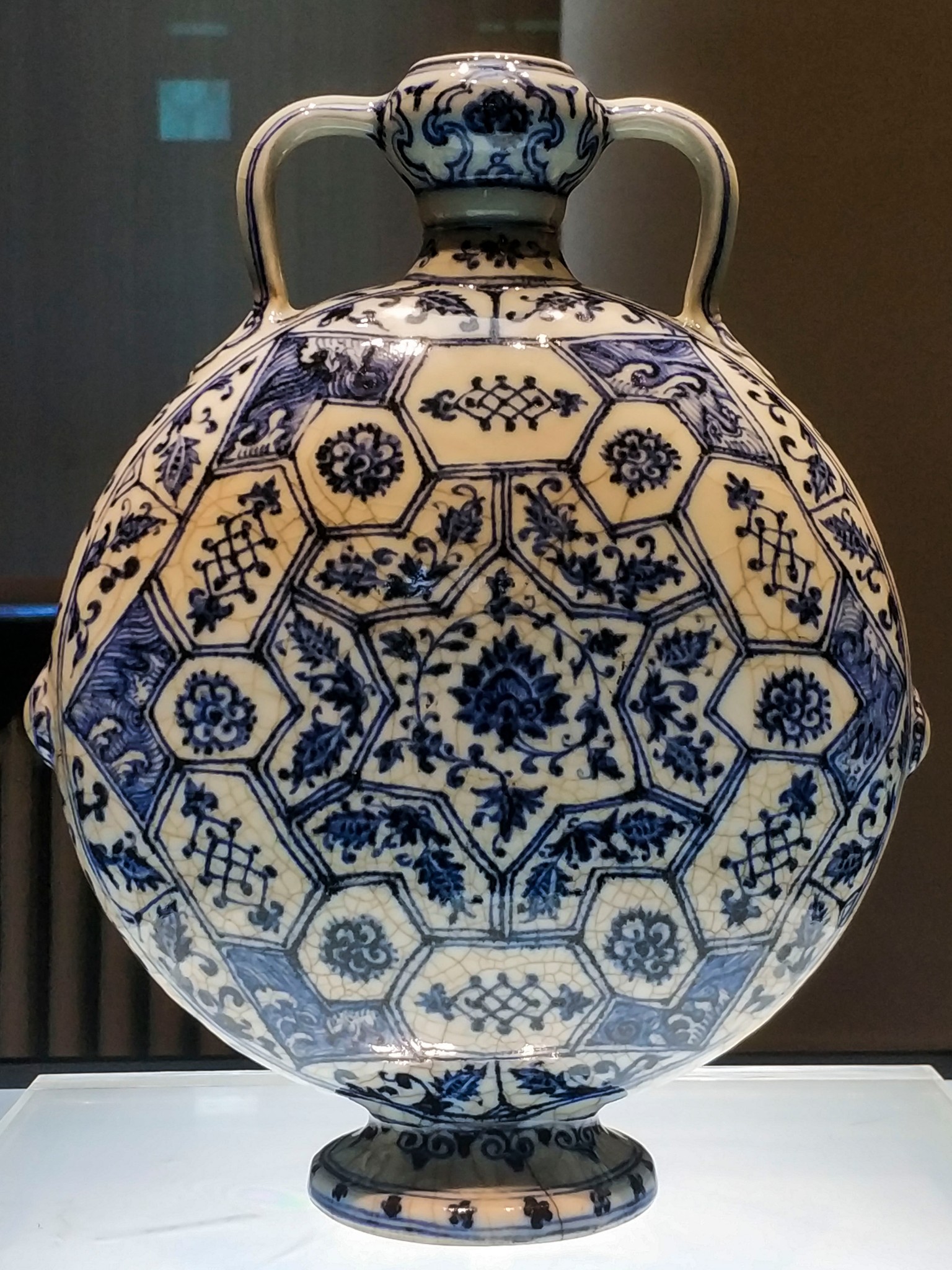 在 旅顺 博物馆主馆二楼的“化土成玉—— 中国 古陶瓷艺术精品展”展厅中,有一个单独的近30平方米的展室,而在展室中央的智能展柜中,摆放着这个展室中唯一的一件展品——明永乐青花锦纹绶带耳扁壶。扁壶高24.4厘米,口径3厘米,足径7.6厘米。蒜头形口,束颈,扁圆腹,撇足。口与肩以绶带形耳相连,腹两侧凸饰乳钉纹。器体图案满饰,蒜头口饰花卉纹,颈部饰卷草纹带,腹部满饰锦纹,腹中心饰六角星形开光,内绘缠枝牡丹纹,以此为中心向外逐层绘出八边形、六边形以及罄形的花格,以合“八荒”“六合”“普天同庆”之寓意,每格内装饰花草纹、波浪纹等。整件造型精巧秀美、端庄 大方 ,恰似亭亭玉立的大家闺秀。纹饰布局精致巧妙,繁而不乱。