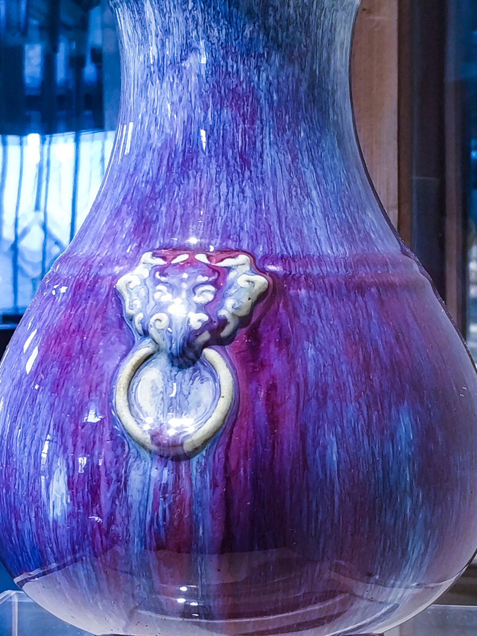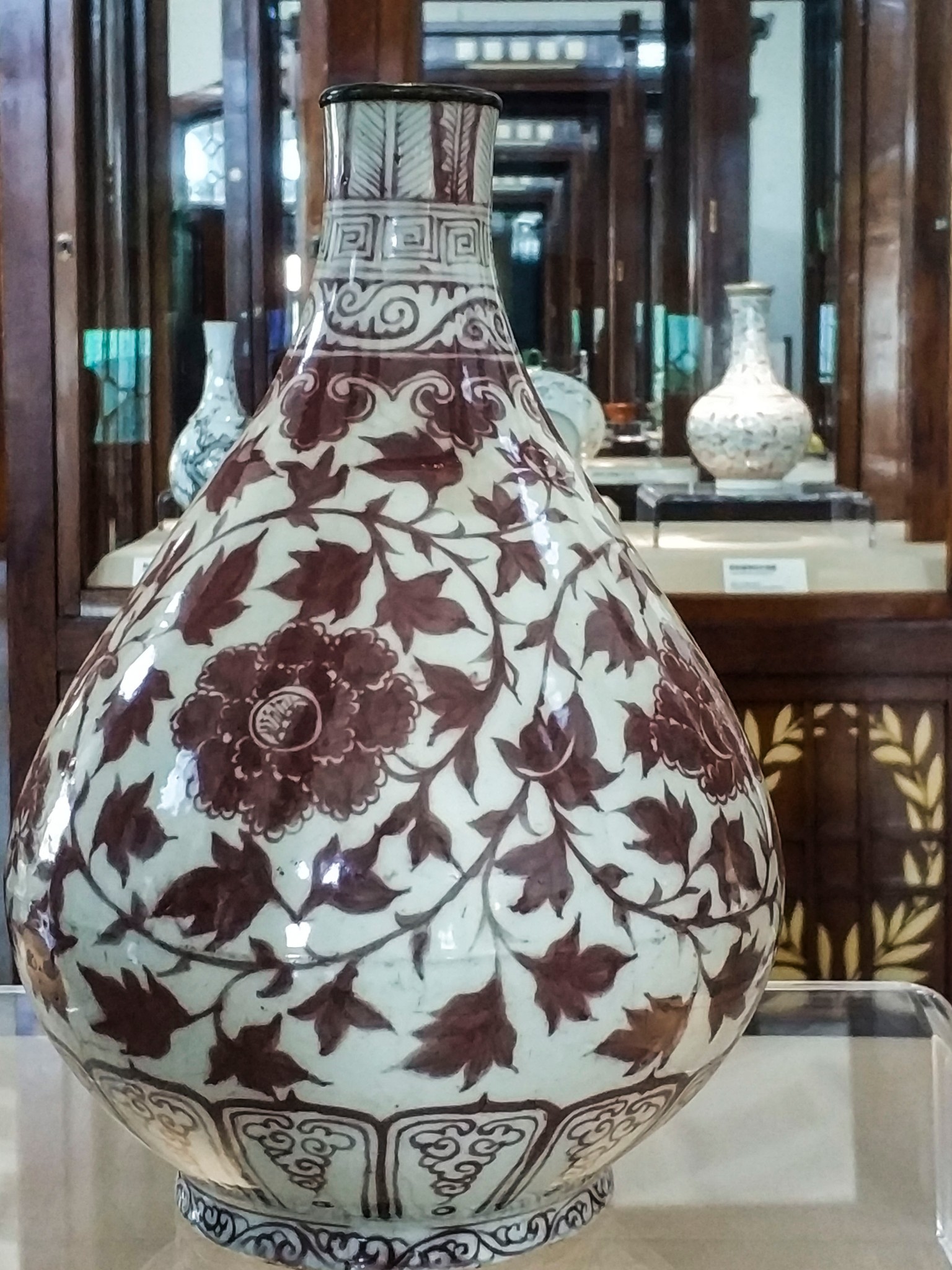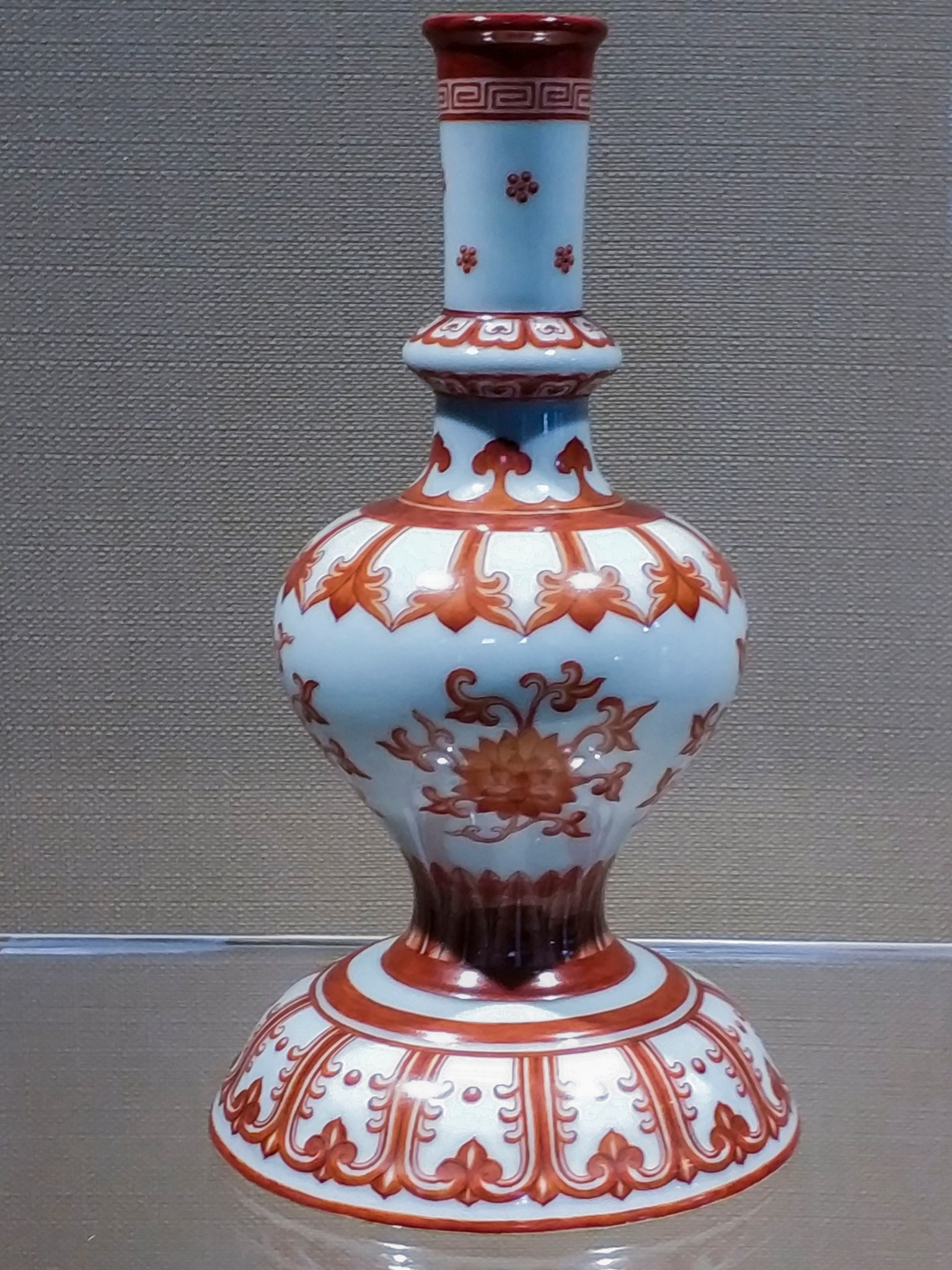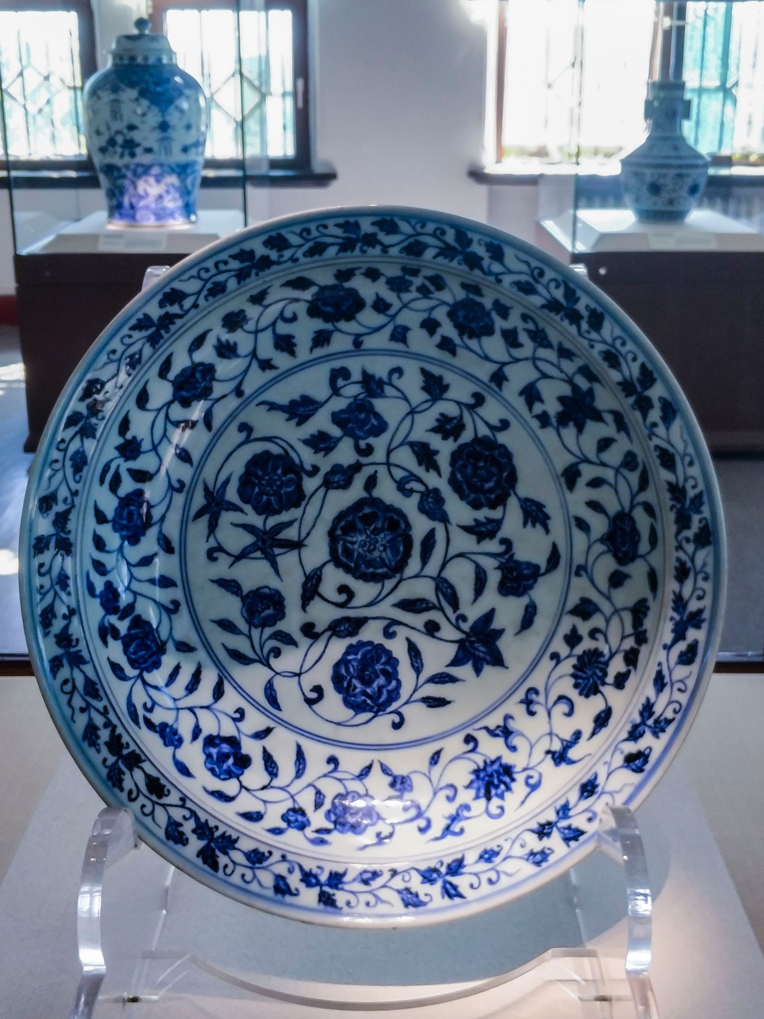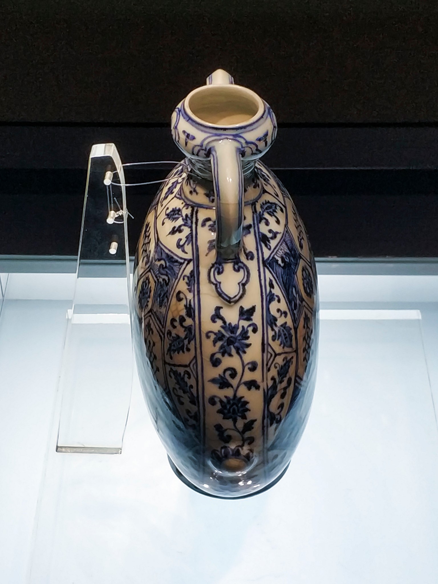 在 旅顺 博物馆主馆二楼的“化土成玉—— 中国 古陶瓷艺术精品展”展厅中,有一个单独的近30平方米的展室,而在展室中央的智能展柜中,摆放着这个展室中唯一的一件展品——明永乐青花锦纹绶带耳扁壶。扁壶高24.4厘米,口径3厘米,足径7.6厘米。蒜头形口,束颈,扁圆腹,撇足。口与肩以绶带形耳相连,腹两侧凸饰乳钉纹。器体图案满饰,蒜头口饰花卉纹,颈部饰卷草纹带,腹部满饰锦纹,腹中心饰六角星形开光,内绘缠枝牡丹纹,以此为中心向外逐层绘出八边形、六边形以及罄形的花格,以合“八荒”“六合”“普天同庆”之寓意,每格内装饰花草纹、波浪纹等。整件造型精巧秀美、端庄 大方 ,恰似亭亭玉立的大家闺秀。纹饰布局精致巧妙,繁而不乱。