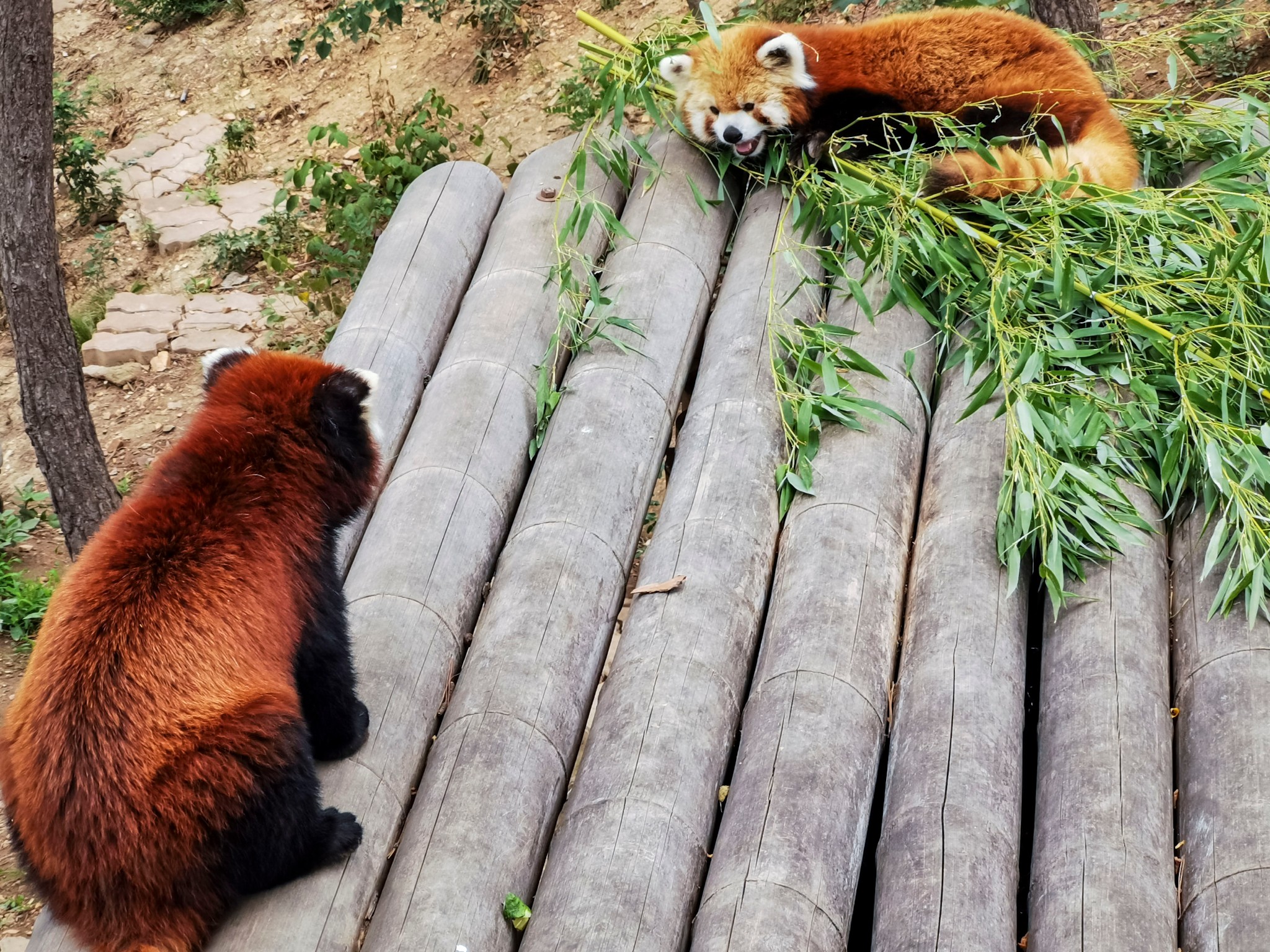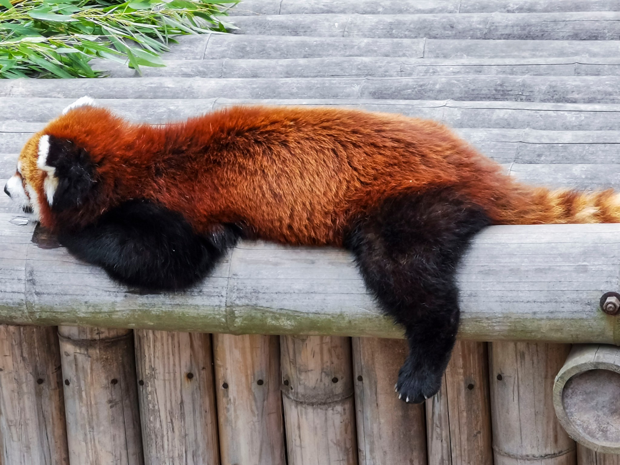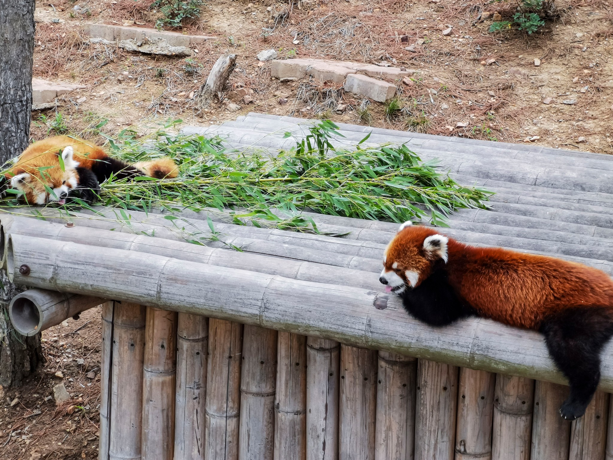 大熊猫不够小熊猫来凑,熊猫馆里除了三只大熊猫,还有许多小熊猫,但小熊猫待遇待遇就不如国宝了,大熊猫悠闲自在地在屋里吹着空调,或吃着竹笋,或睡懒觉,小熊猫在室外热得直伸舌头。