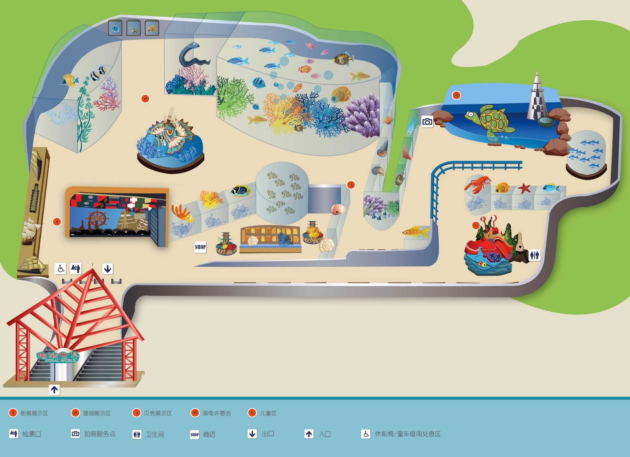 珊瑚世界是纯展示性场馆,以珊瑚为主题,无动物表演。这里汇聚了世界上的百余种、一千多个珊瑚礁生物群,采用活体珊瑚维生技术,通过各种现代科技表现手法,惟妙惟肖地再现了海洋中的珊瑚生态系统;同时,还有上千尾珍稀鱼类及十几种珍稀贝类,与珊瑚相映成趣,共同构成了一个神奇莫测、绚丽无比的海底花园。