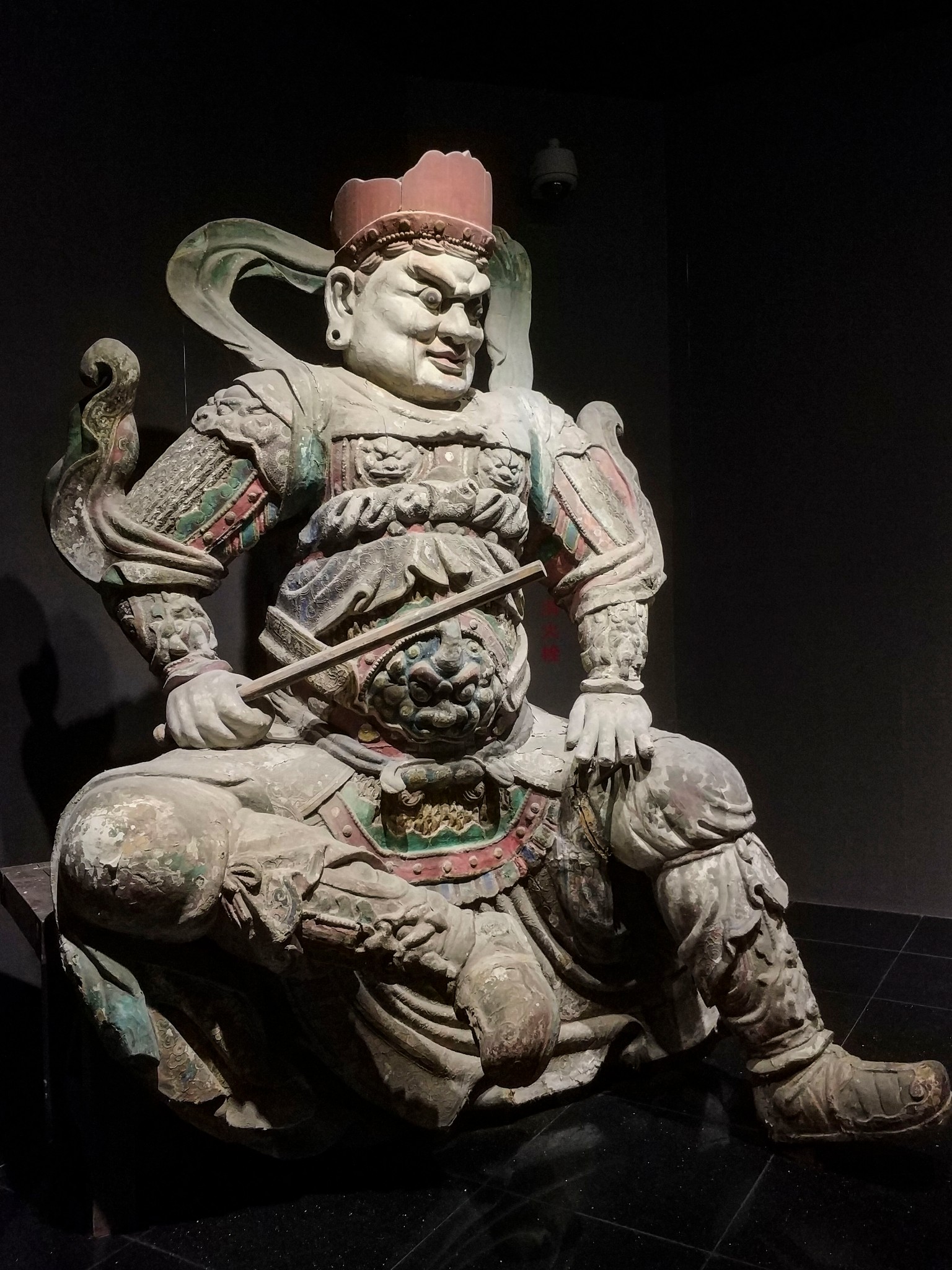 该俑像为木胎、泥塑、彩绘,目视前方,双唇紧抿,施红彩,胡须浓密,面目清晰,溜肩膀,右手自然下垂,左手微举,呈牵缰绳状。头戴黑色软脚襥头,身着红色圆领长袍,脚着皂靴,通体着色。马为白色,四足直立,马首微昂,剪鬃缚尾,鞍鞯、辔饰俱全,以墨彩描绘。