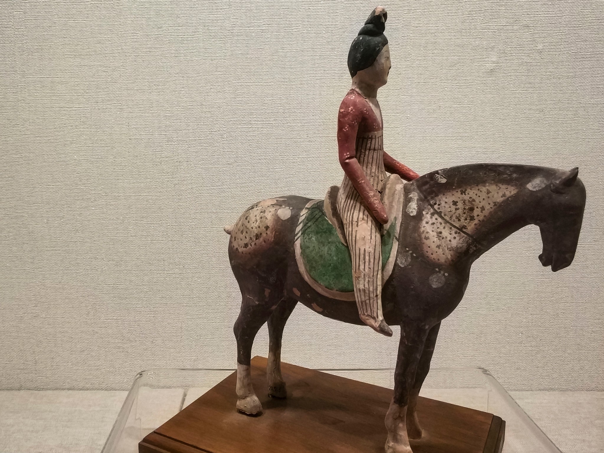女俑发髻高挽,面涂白粉点红唇,柳眉细眼,额上饰“鹅黄”,目视前方,骑坐于马背,左手微举,呈牵缰绳状。上身穿红地白花长袖襦,下身着白、棕色相间的竖条纹宽松式裤。设色艳丽,造型准确。马为酱色,颈及臀部有白花斑,鞍鞯以绿彩饰之,四蹄涂白彩,剪鬃束尾。