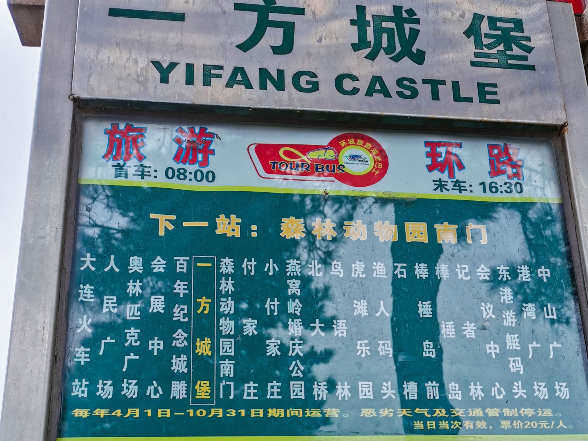 出发前从网上查了一些信息,决定从火车站坐巴士到达一 方城 堡站,从此处步行到傅家庄公园。若是你住的离星海广场更近,或者游完星海广场后想继续游览滨海路,就不需要去火车站乘车,一 方城 堡站有临时售票点,可以在这买票上车,但终点站还是火车站。每辆巴士上面都会有一个讲解,从火车站到一 方城 堡的路上,讲解会介绍一遍乘车注意事项和沿途景点,当然也会推荐贝壳博物馆、莲花山观景台、老虎滩四维电影《飞跃 大连 》、 东港 游艇项目等,若是感兴趣可以在讲解那儿买票,没兴趣也不会强制消费。